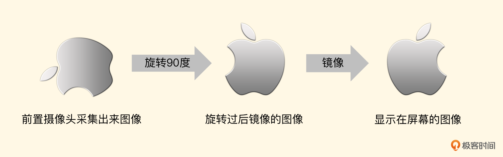 上述纹理坐标是默认摄像头给出的图像纹理坐标,但前面我们给摄像头做过一个特殊的设置,就是给 AVCaptureConnection设置videoOrientation这个参数,摄像头默认是横向视频输出,当把这个参数设置为Portrait时,就要求摄像头按照竖直方向输出视频。这时候目标纹理对象的宽高和CVPixelBuffer的宽高一致了,那么后置摄像头采集出来的图像直接绘制即可。