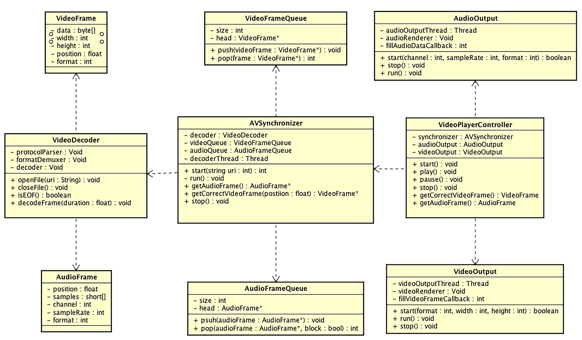 - VideoPlayerController:调度器模块的类,内部维护音视频同步模块、音频输出模块、视频输出模块,向上层业务暴露开始播放、暂停、继续播放、停止播放等接口;向音频输出模块和视频输出模块暴露两个获取裸数据的接口。