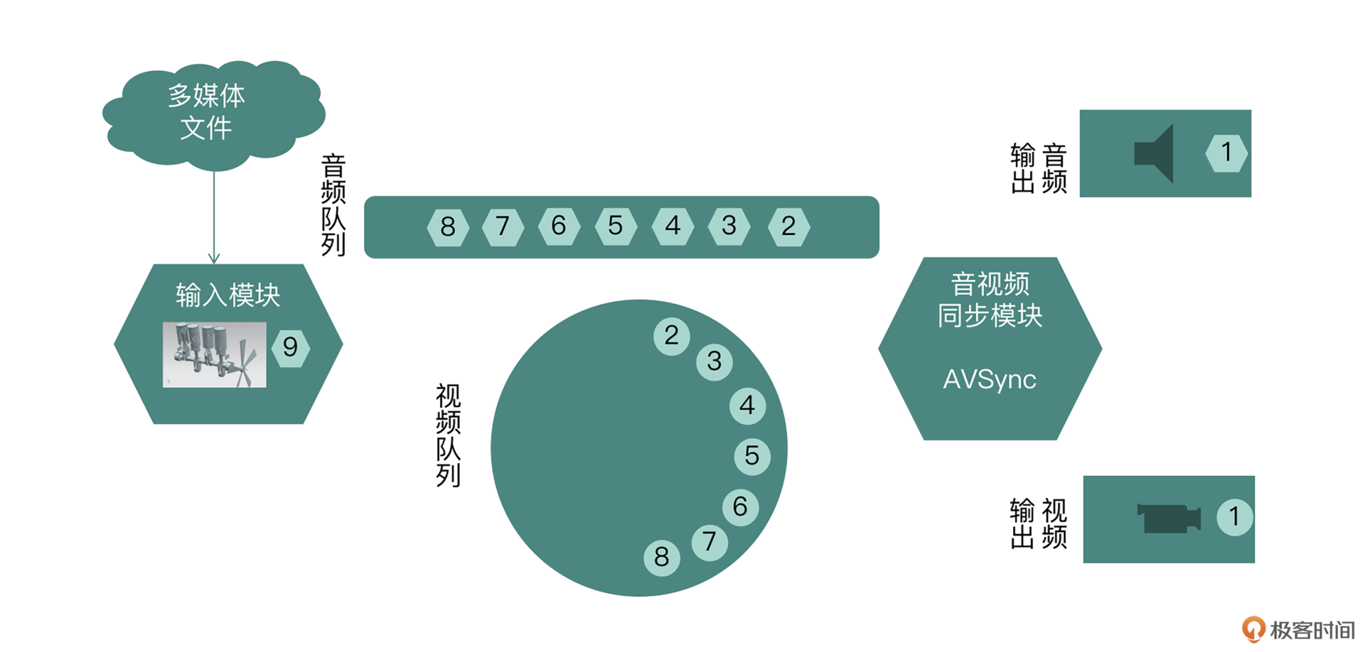 那接下来再看输出是什么,输出就是让用户可以听到、看到这个视频,也就是可以把视频中的音频播放出来,同时把视频画面渲染到屏幕上,并且让声音和画面同步播放出来,这样我们进一步确定了输出;最后一步我们根据输入和输出来拆分模块,并给模块分配合理的职责,其实就是需要将输入资源和掌握的音视频能力进行合理的规划和使用,来实现最终的输出结果,但这个问题相比前两个问题要复杂得多,我会带着你来慢慢分析。