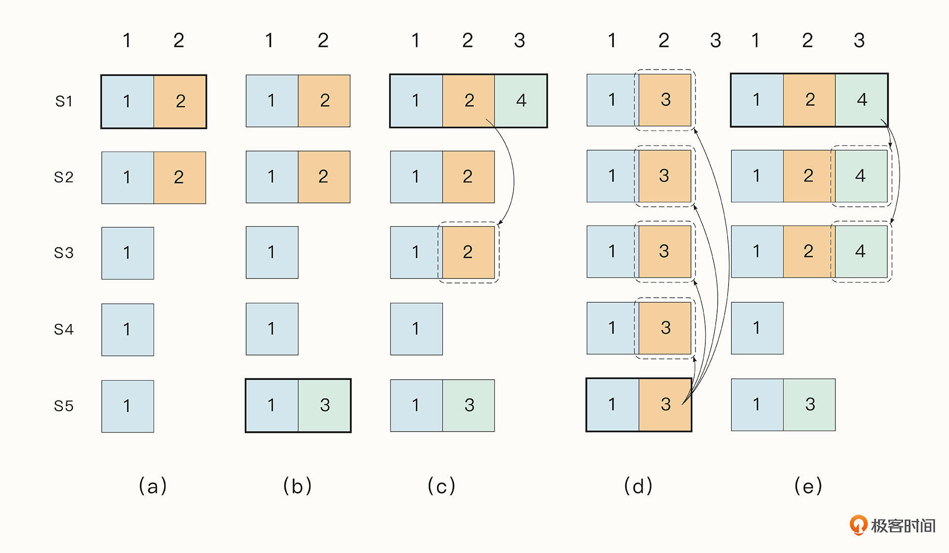 从这张图可以看出,一个已经被Committed的Entry是有可能被覆盖掉的。例如在a阶段,节点s1成为了Leader,Entry 2还没有成为Committed。在b阶段,s1崩溃,s5成为了Leader ,添加Entry到自己的log中,但是仍然没有commit。在c阶段,s5崩溃,s1成为了Leader,而且在这个过程中Entry 2成为了Committed Entry。接着在d阶段s1崩溃,s5成为了Leader,它会将本已commit的Entry 2给覆盖掉。但我们真正想期望的是e这种情况。