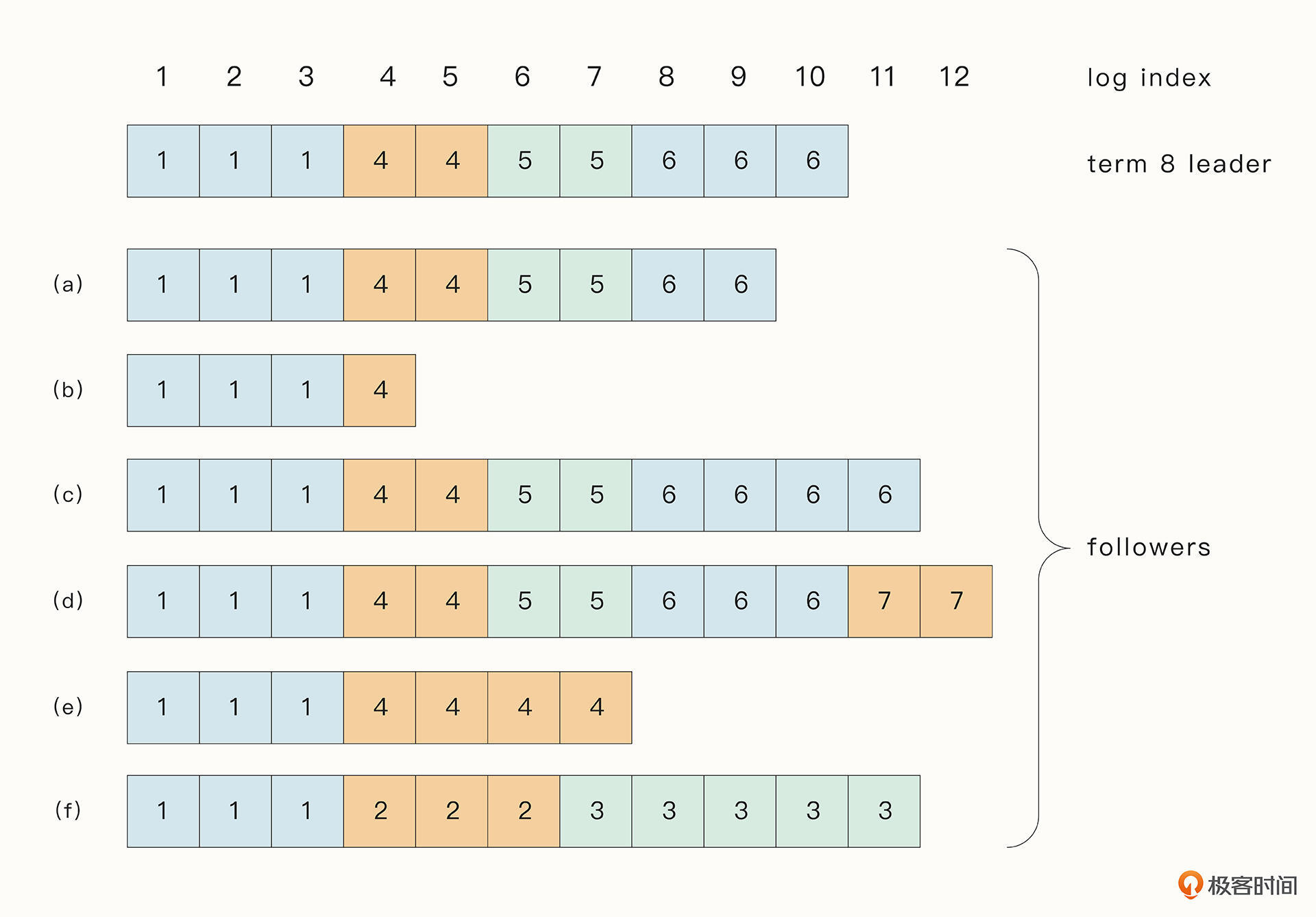 在实际生产过程中,Raft算法可能会因为分布式系统中遇到的难题(例如节点崩溃),出现多种数据不一致的情况。如下所示,a → f分别代表Follower的复制日志中可能遇到的情况,方框中的方格表示当前节点复制日志中每一个Entry对应的Term序号。