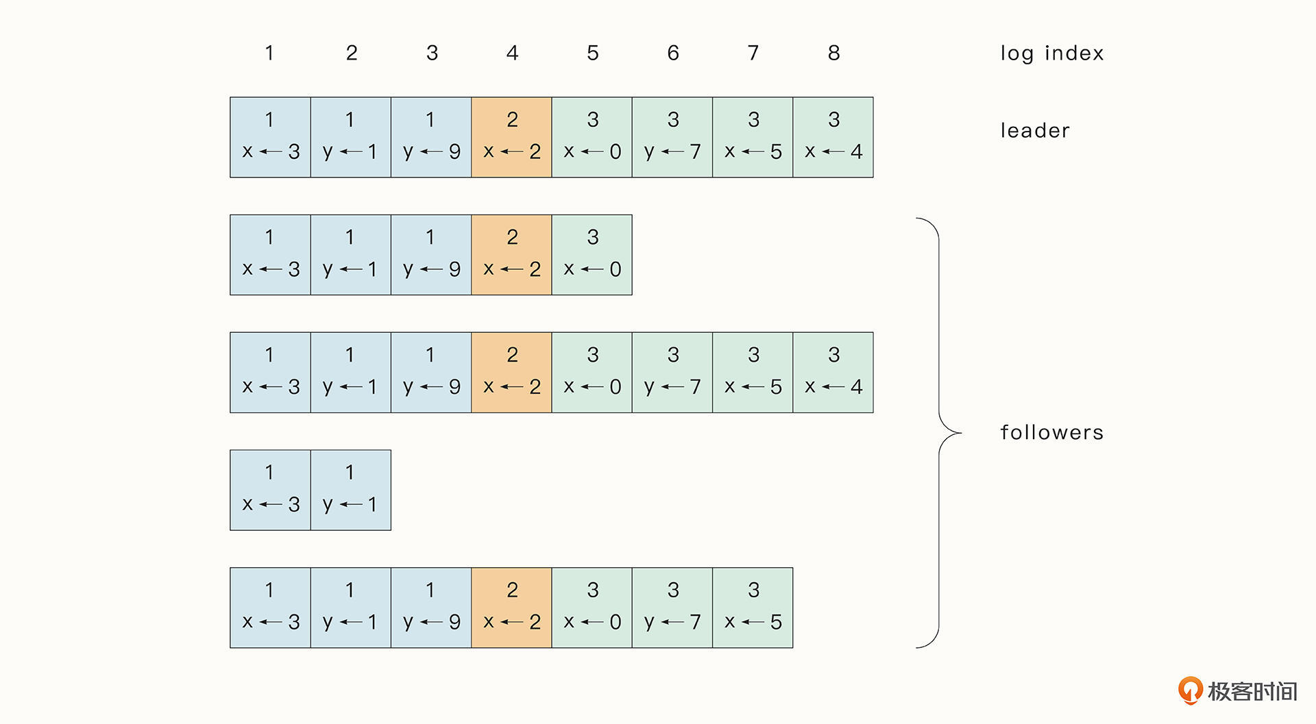 所以我们可以看到,在正常的情况下,Raft可以满足上面的两个属性,但是异常情况下,这种情况就可能被打破,出现数据不一致的情况。为了让数据保持最终一致,Raft算法会强制要求Follower的复制日志和Leader的复制日志一致,这样一来,Leader就必须要维护一个Entry index了。在这个Entry index之后的都是和Follower不相同的Entry,在这个Entry之前的都是和Follower一致的Entry。