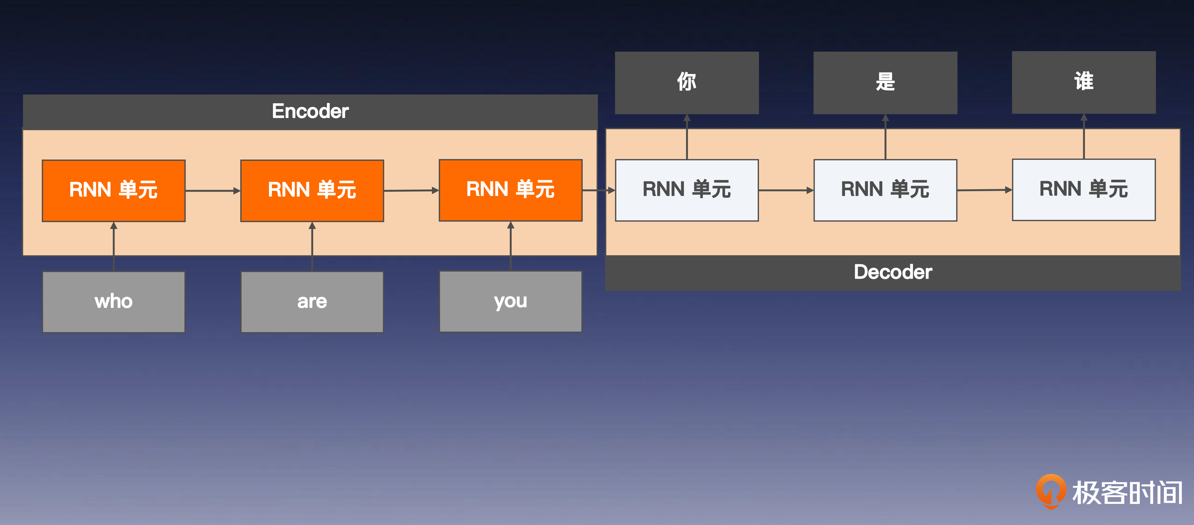 如果你认真学习了前面的课程,理解编、解码器的工作原理将非常轻松。我们以机器翻译为例来带你梳理一下。