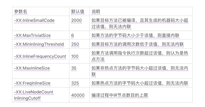 我在上面的表格列举了一些C2相关的虚拟机参数。总体来说,即时编译器中的内联算法更青睐于小方法。