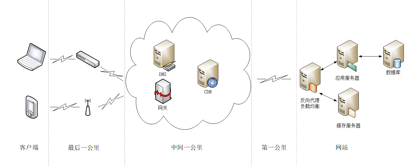 “最后一公里”是用户访问互联网的入口,对于固网用户就是光纤、网线,对于移动用户就是WiFi、基站。以前它是客户端性能的主要瓶颈,延迟大带宽小,但随着近几年4G和高速宽带的普及,“最后一公里”的情况已经好了很多,不再是制约性能的主要因素了。