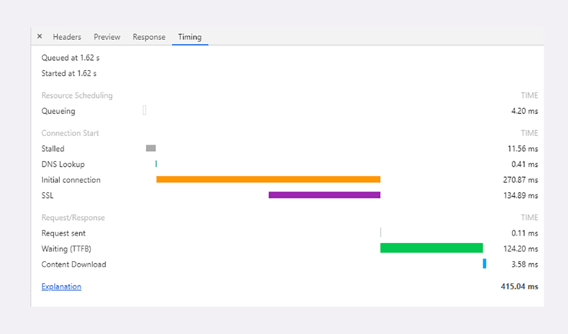 从这张图你可以看到,一次HTTP“请求-响应”的过程中延迟的时间是非常惊人的,总时间415.04毫秒里占了差不多99%。