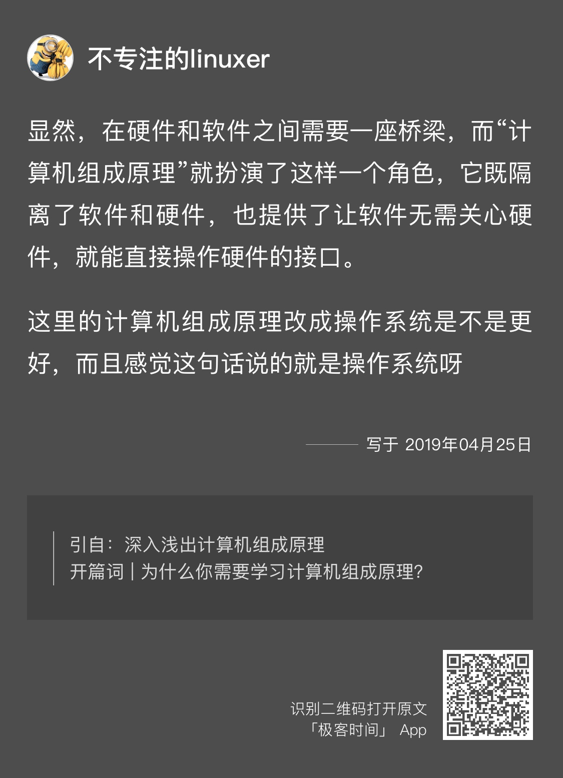 其次,读书的时候我们认为一个东西掌握扎实了,有时候其实未必。很多人估计都有感受,像计算机这类实践性比较强的专业,书上所学和真正实践中所用完全是两码事。背出计算机的五大组成部分,似乎和我们的实际应用没有联系,但是在实际的系统开发过程中,无论是内存地址转换使用的页表树这样的数据结构,还是各个系统组件间通过总线进行通信的模式,其实都可以和我们自己的应用系统开发里的模式和思路联系起来。