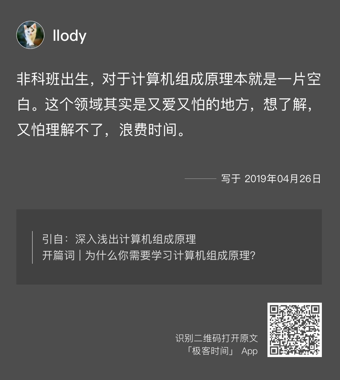所以,这门课我的目标就是尽量讲得“理论和实践相结合”,能和你的日常代码工作结合起来。让非科班的同学们也能学习到计算机组成原理的知识,所以在深入讲解知识点之外,我会尽量和你在开发过程中可能遇到的问题放到一块儿,只要跟着课程的节奏走,不会跟不上哦。(跟到这里的同学可以在留言区冒个泡,给跟不上的同学招个手,让他们放心大胆看过来。)