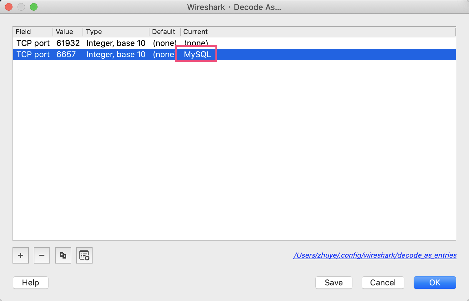 如果列表中的Protocol没有显示MySQL的话,你可以手动点击Analyze菜单的Decode As菜单,然后加一条规则,把6657端口设置为MySQL协议:
