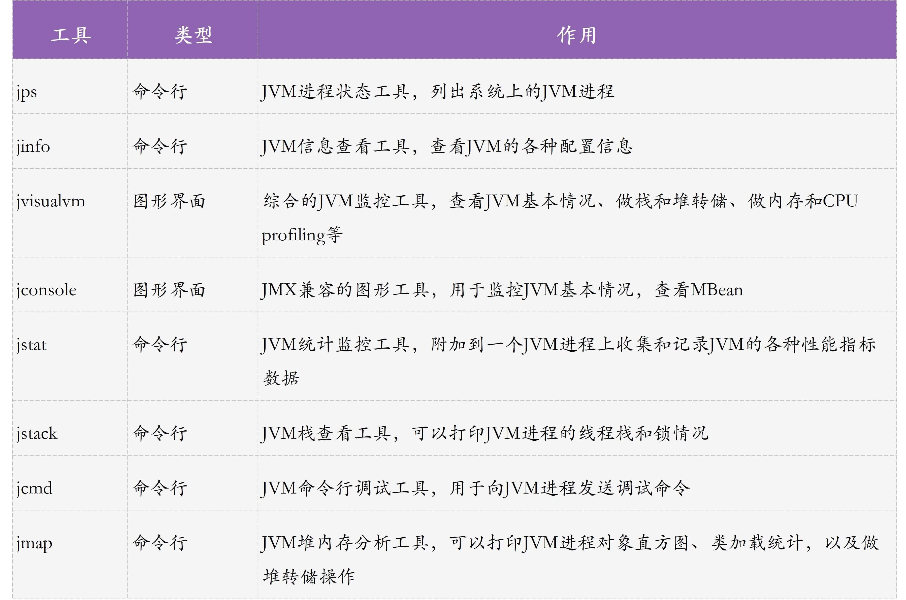 除了jps、jinfo、jcmd、jstack、jstat、jconsole、jvisualvm外,JDK中还有一些工具,你可以通过官方文档 查看完整介绍。