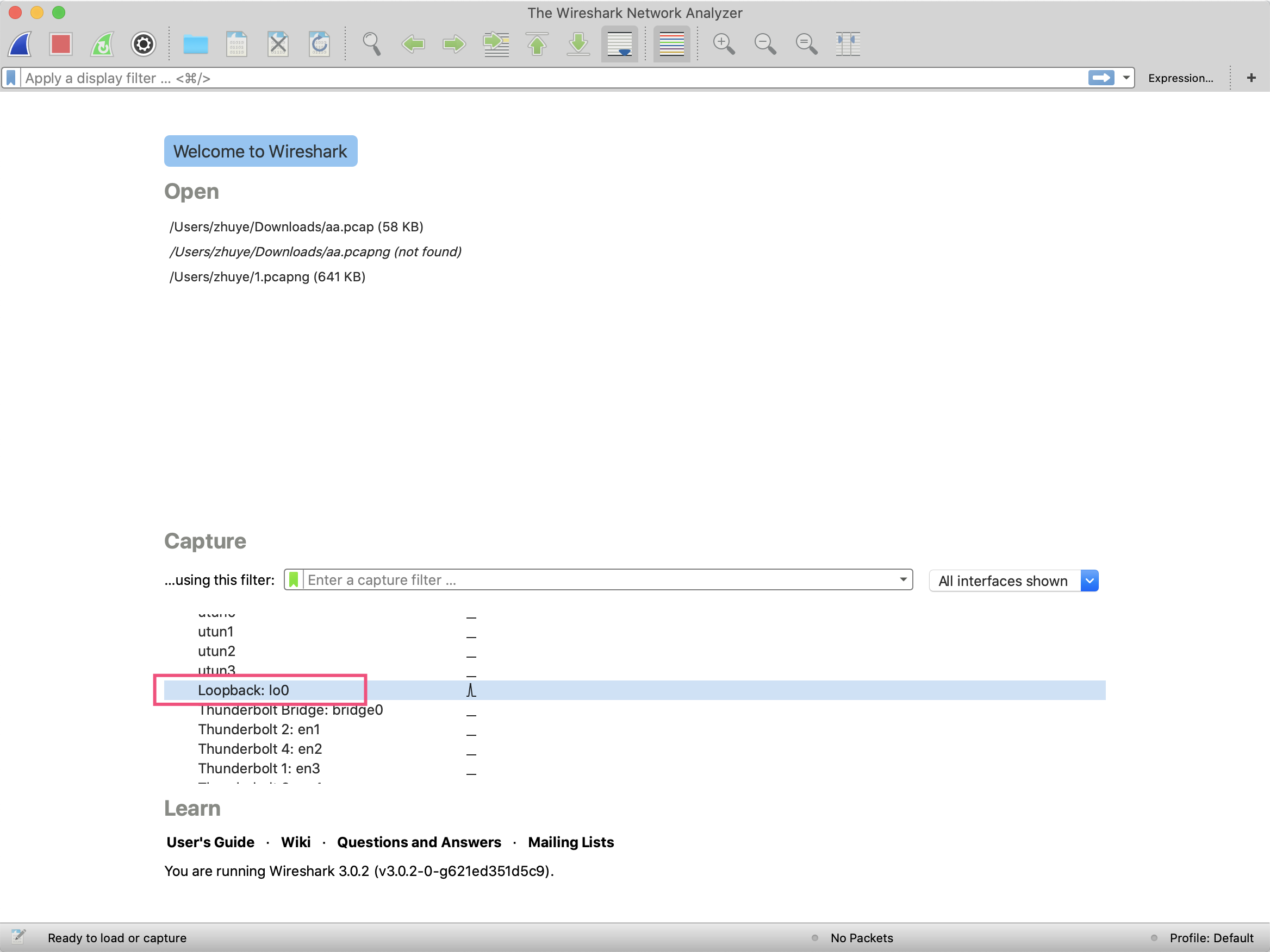 首先,我们可以在这里 下载Wireshark,启动后选择某个需要捕获的网卡。由于我们连接的是本地的MySQL,因此选择loopback回环网卡: