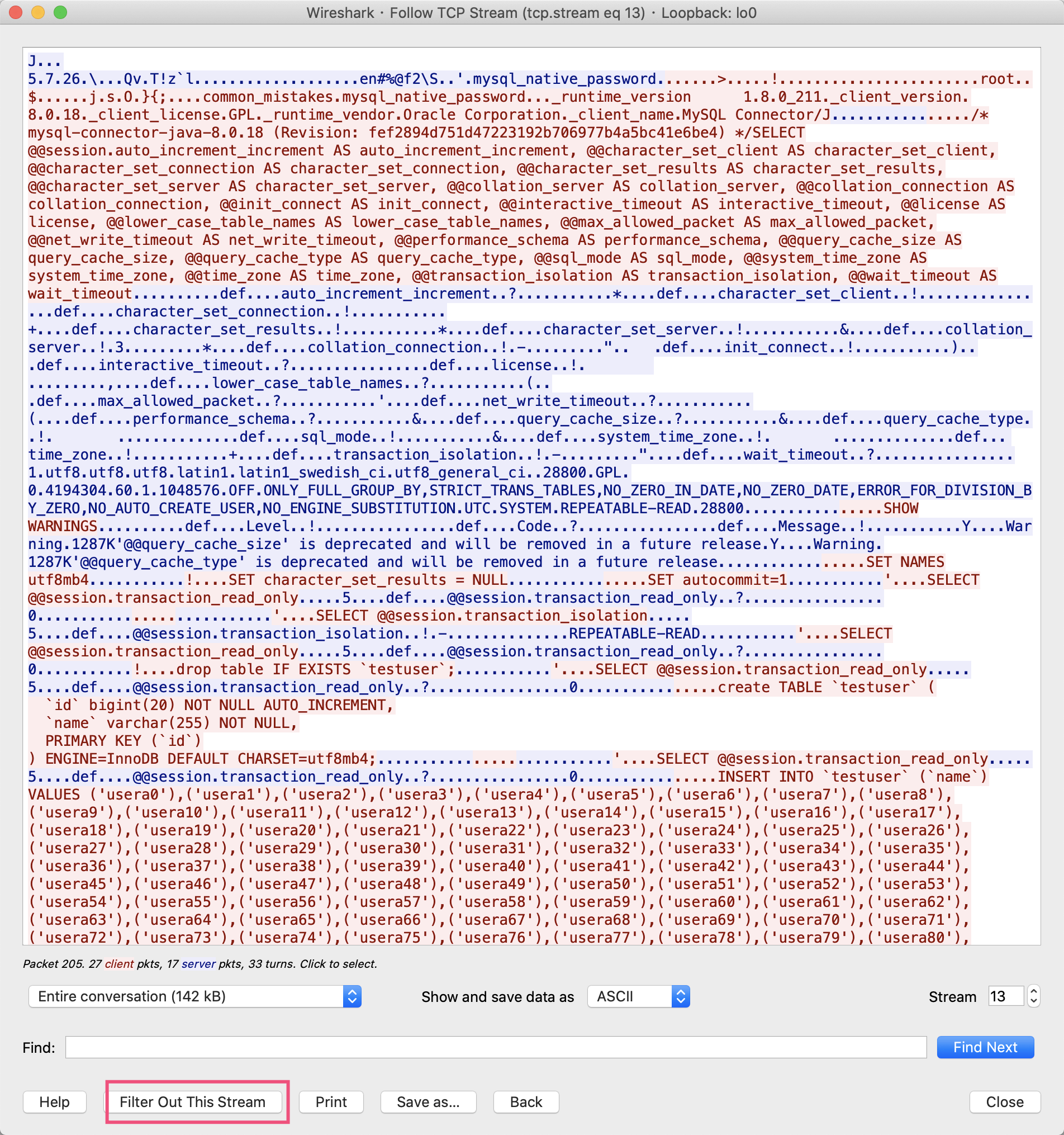 可以看到,程序运行期间和MySQL有大量交互。因为Wireshark直接把TCP数据包解析为了MySQL协议,所以下方窗口可以直接显示MySQL请求的SQL查询语句。我们看到,testuser表的每次insert操作,插入的都是一行记录 :
