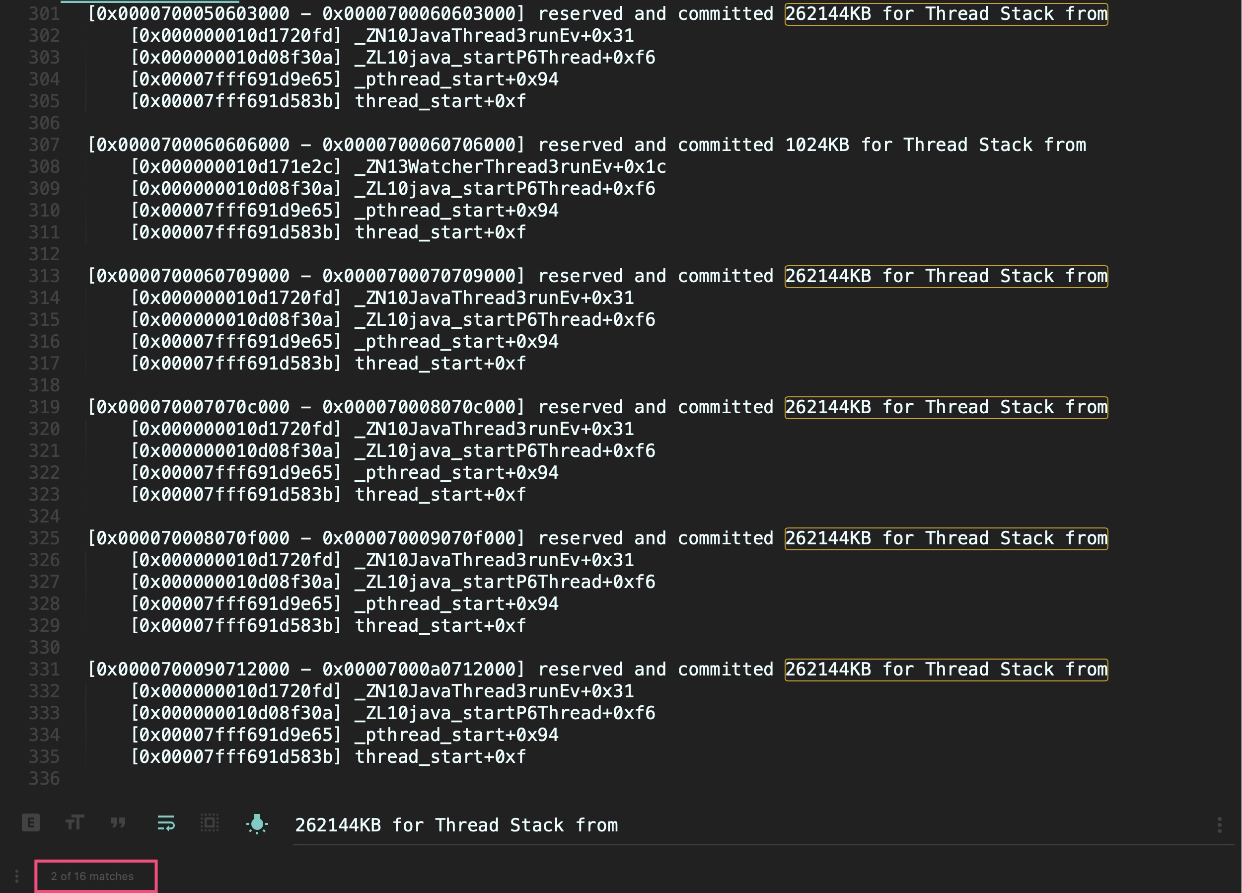 可以看到,有16个可疑线程,每一个线程保留了262144KB内存,也就是256MB (通过下图红框可以看到,使用关键字262144KB for Thread Stack from搜索到了16个结果):