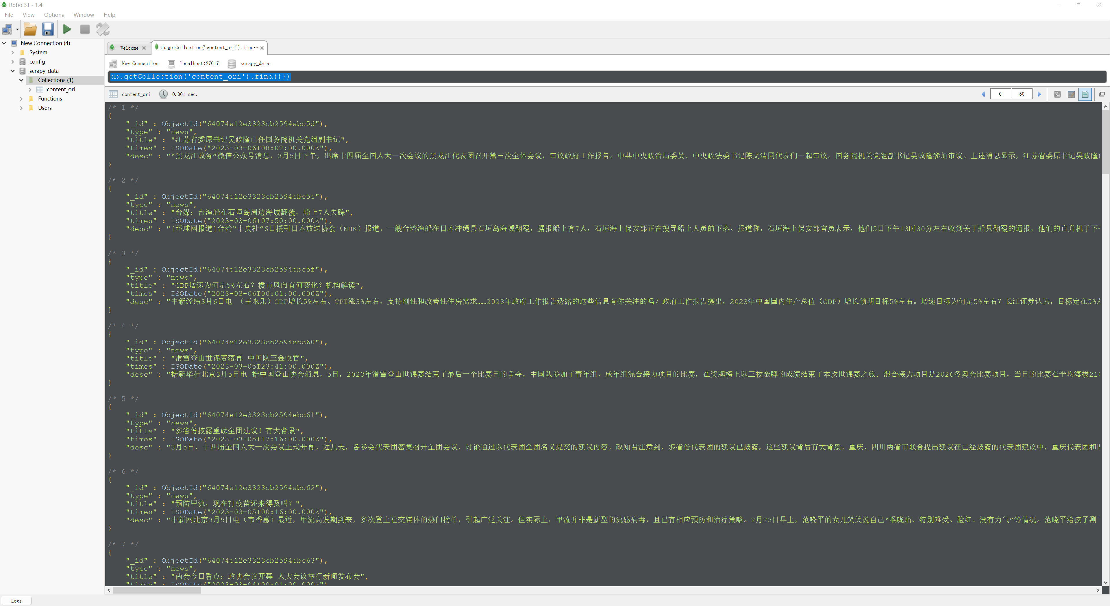 这里我们选择的数据库为scrapy_data,并且选择一个collection为“content_ori”。之前我们讲过,在MongoDB中如果已经有一个collection了,选择的时候就会直接去用。如果没有这个collection,则会自动创建collection。目前在我们的数据库中并没有名为“content_ori”这个collection,会自动创建。
