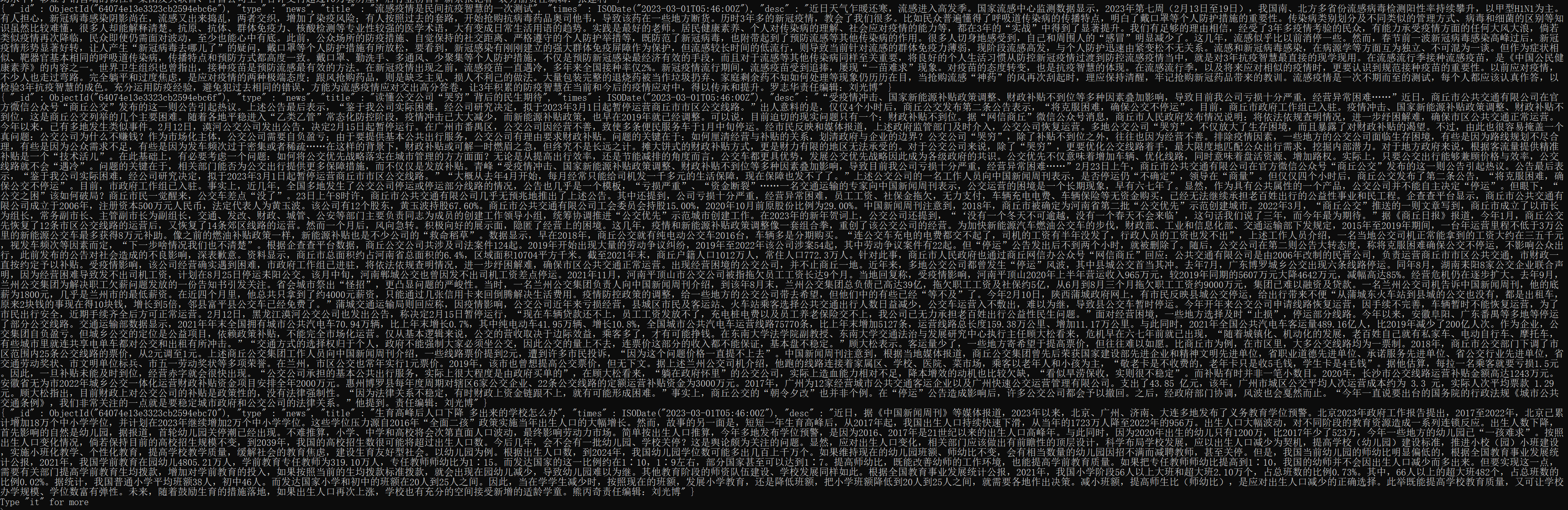 当爬虫结束爬取工作之后,我们来验证一下数据是否已经存入到MongoDB数据库中。这个时候,我们可以在cmd命令中输入mongo,进入到MongoDB的控制台,然后输入下面的代码。
