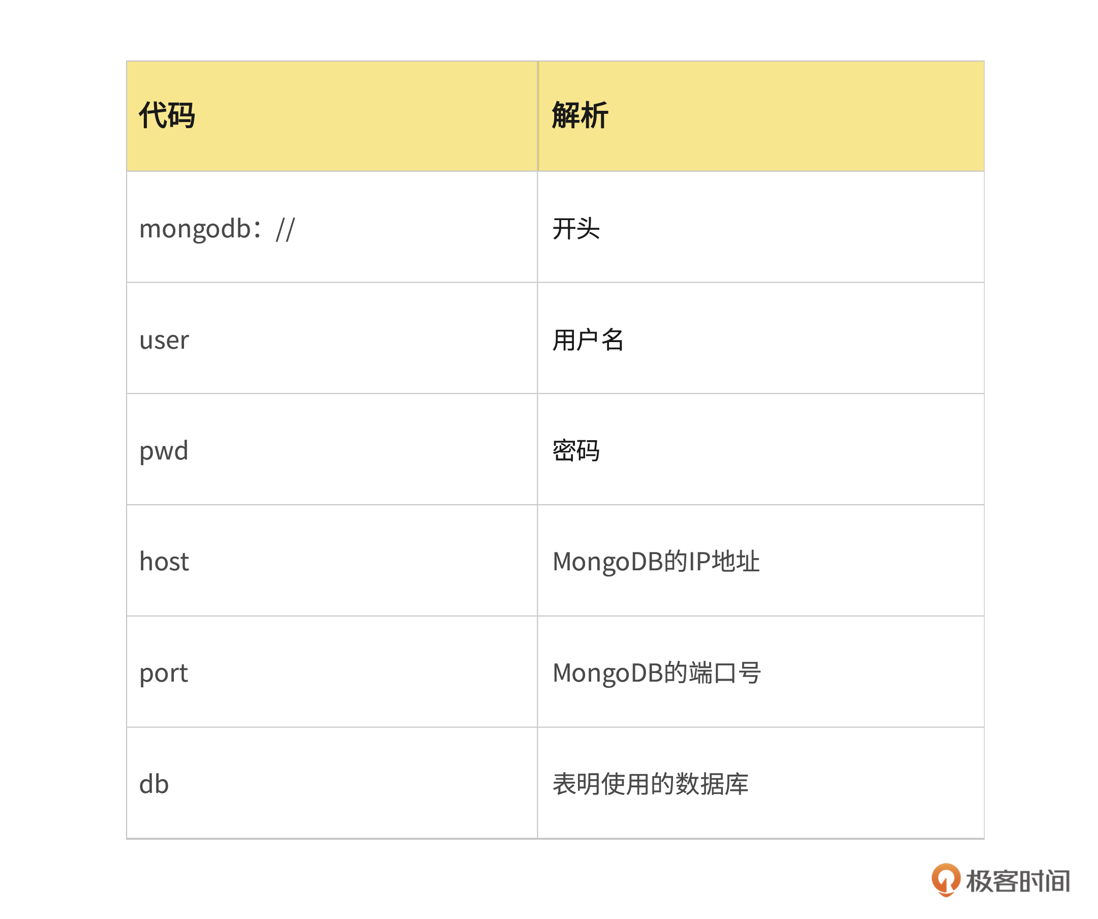 另外,MongoDB数据库的连接需要遵循MongoDB的通讯协议,格式如下,我给你画了一个表格简要解析了这行代码,你可以对照着进行学习。
