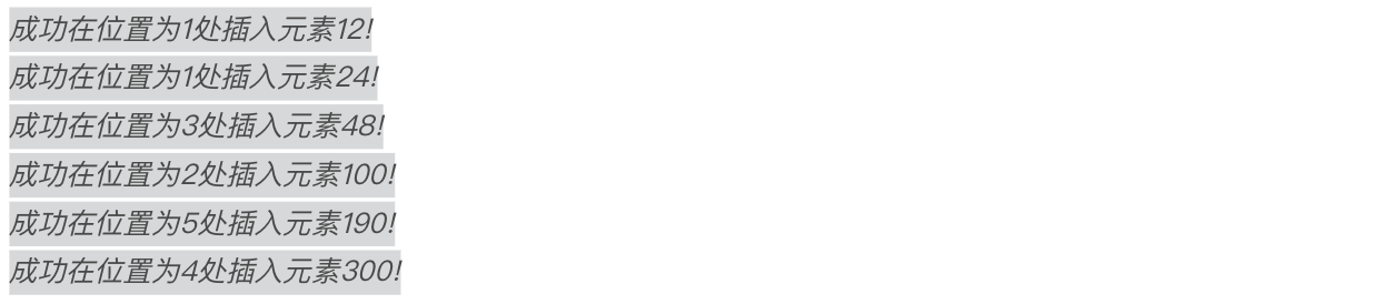 | slinkobj.ListInsert(1, 12); slinkobj.ListInsert(1, 24); slinkobj.ListInsert(3, 48); slinkobj.ListInsert(2, 100); slinkobj.ListInsert(5, 190); slinkobj.ListInsert(4, 300);