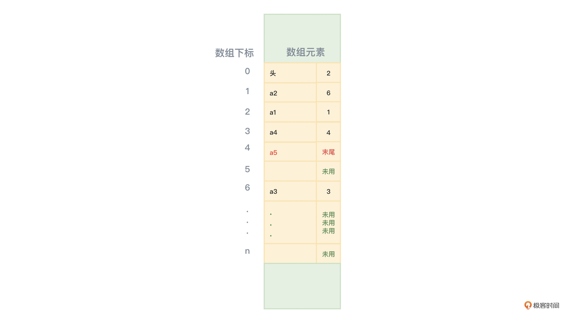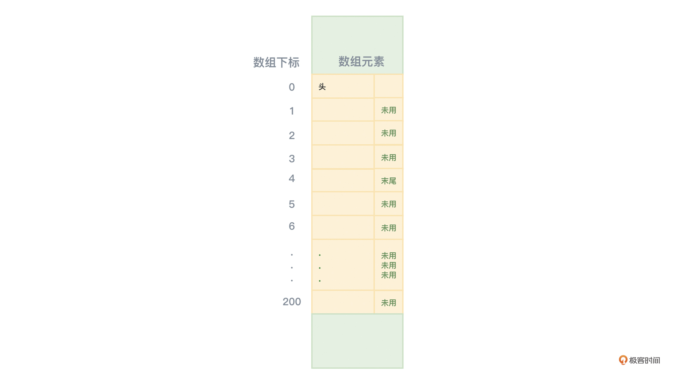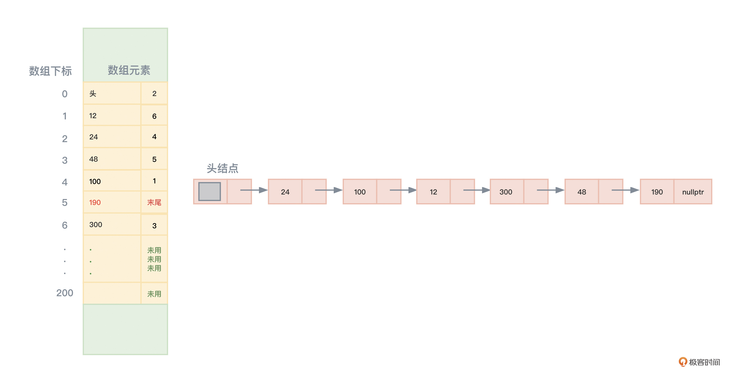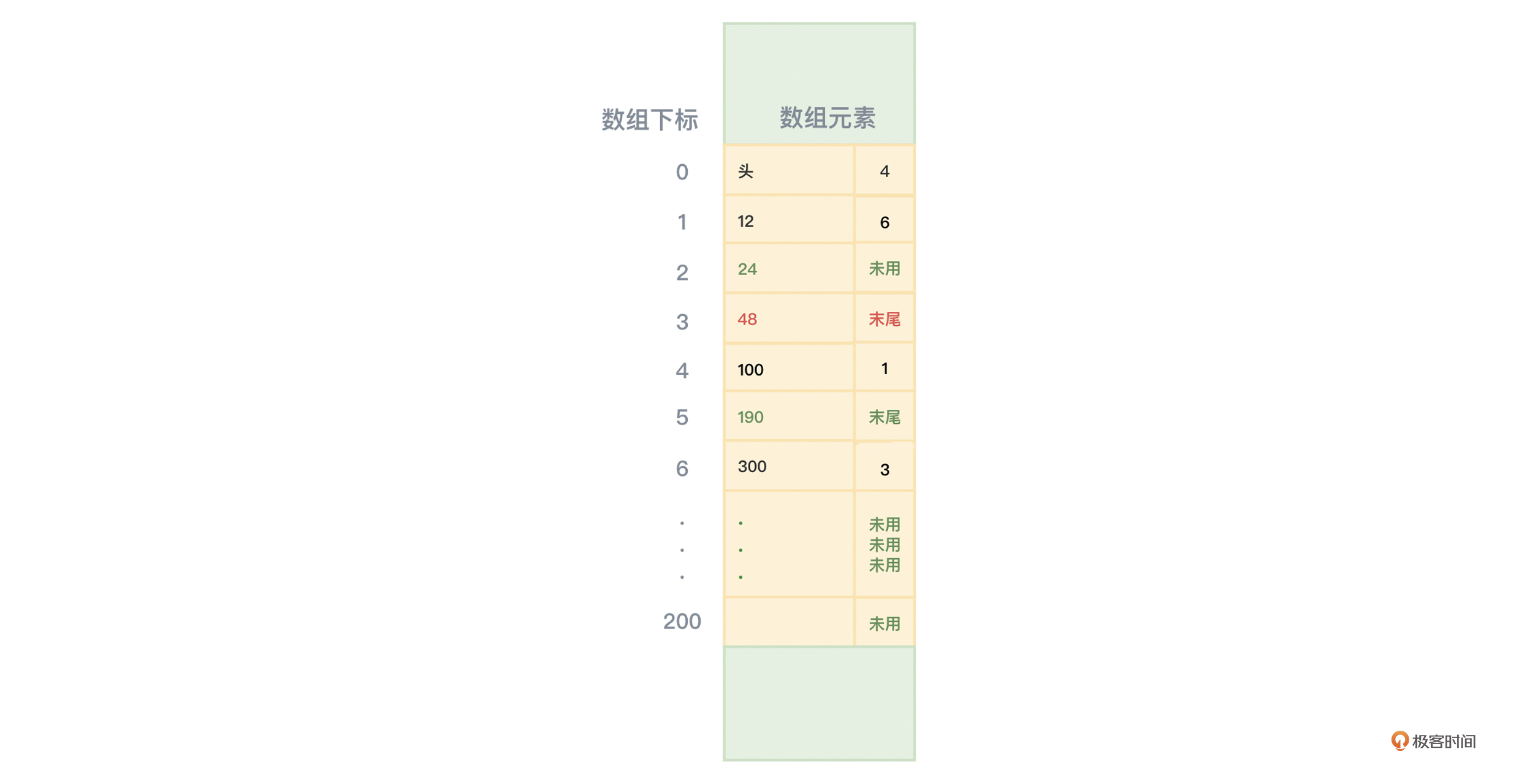 这样的静态链表实现方式,虽然代码会更加繁琐,但在插入数据的时候可以明显提高寻找空闲节点的效率,时间复杂度会从O(n)变为O(1)。如果你有兴趣,也可以自行实现相关的代码。