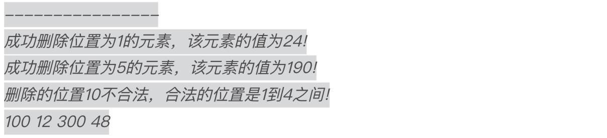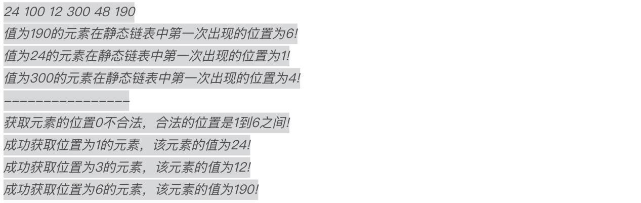 | slinkobj.DispList(); slinkobj.LocateElem(190); slinkobj.LocateElem(24); slinkobj.LocateElem(300); cout << "----------------" << endl; int eval = 0; slinkobj.GetElem(0, eval); //如果GetElem()返回true,则eval中保存着获取到的元素值 slinkobj.GetElem(1, eval); slinkobj.GetElem(3, eval); slinkobj.GetElem(6, eval);