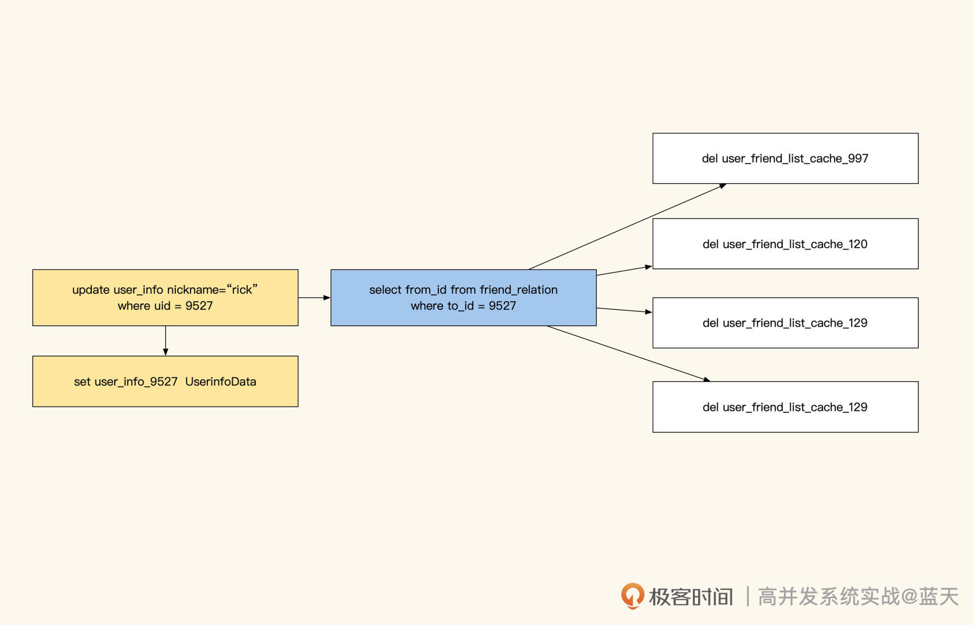 不过,通过队列更新消息这一步,我们还会碰到一个问题——条件批量更新的操作无法知道具体有多少个ID可能有修改,常见的做法是:先用同样的条件把所有涉及的ID都取出来,然后update,这时用所有相关ID更新具体缓存即可。
