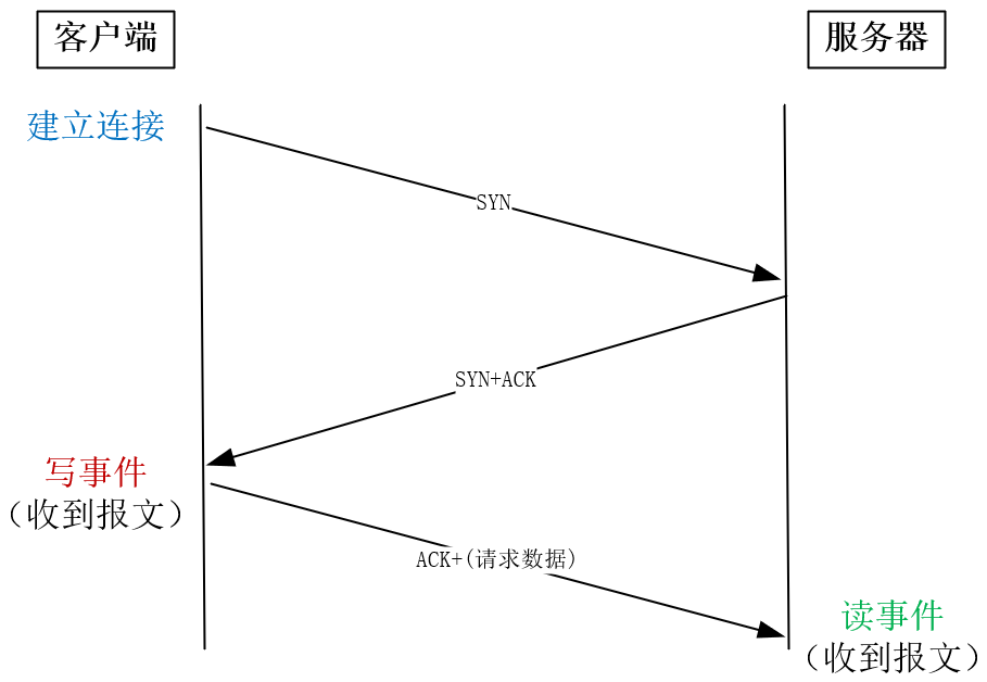 客户端首先发送SYN报文给服务器,而服务器收到后回复ACK和SYN(这里我们只需要知道产生事件的过程即可,下一讲会详细介绍这两个报文的含义),**当它们到达客户端时,双向连接中由客户端到服务器的通道就建立好了,此时客户端就已经可以发送请求了,因此客户端会产生写事件。**接着,客户端发送ACK报文,到达服务器后,服务器上会产生读事件,因为进程原本在监听80等端口,此时有新连接建立成功,应当调用accept函数读取这个连接,所以这是一个读事件。