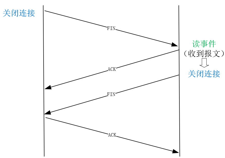 如同建立连接需要双向建立一样,关闭连接也需要双方各自关闭每个方向的通道。主动关闭的一方发送FIN报文,到达被动方后,内核自动回复ACK报文,这表示从主动方到被动方的通道已经关闭。但被动方到主动方的通道也需要关闭,所以此时被动方会产生读事件,提醒被动方调用close函数关闭连接。