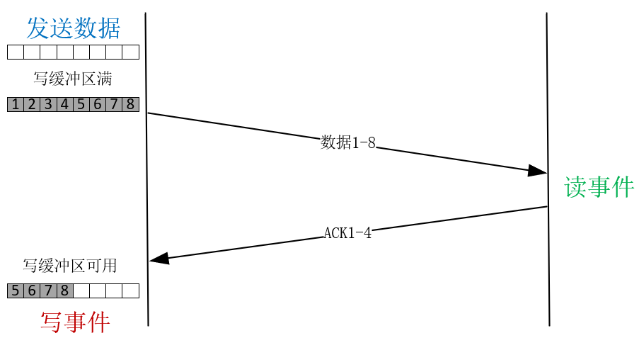 在建立好的TCP连接上收发消息时,读事件对应着接收到对方的消息,这很好理解。写事件则稍微复杂些,我们举个例子加以说明。假设要发送一个2MB的请求,当调用write函数发送时,会先把内存中的数据拷贝到写缓冲区中后,再发送到网卡上。