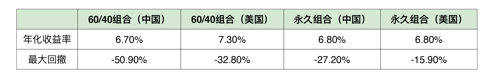 只要你稍微有一点理财经验,你就知道这个年化收益不仅远高于货币基金3%左右的年化收益,还远高于市面上任何一款银行理财产品的年化收益。更重要的是,永久组合在中美市场的最大回撤仅有27.2%和15.9%,又远低于A股50%以上的最大回撤,风险小很多。