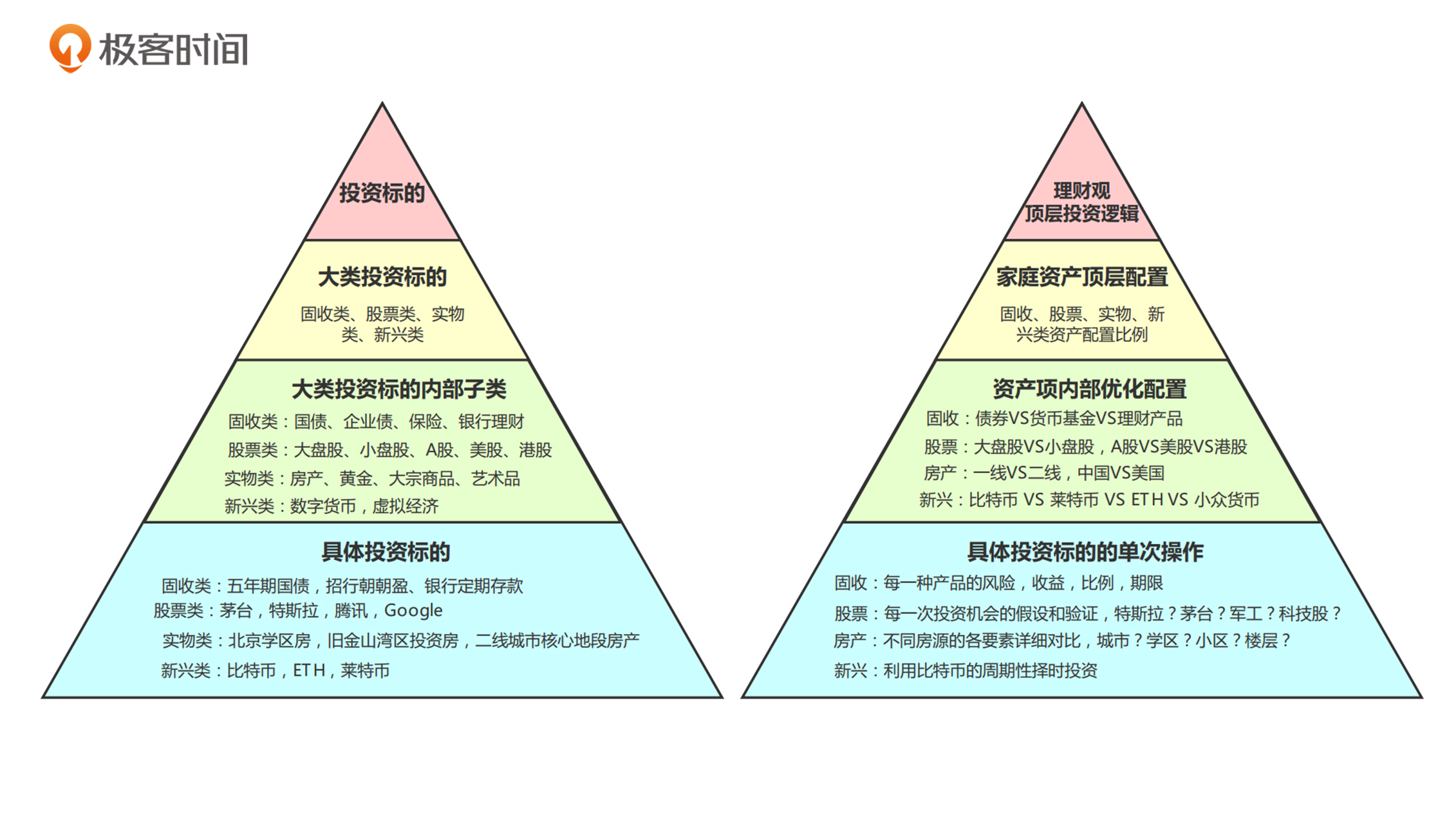这四大类投资标的还可以具体往下细分:每一类投资标的都有内部子类,每一个子类中又有很多具体的投资标的。这样,就可以组成一个从大类到小类,由高层级到低层级排列的**投资标的金字塔。**具体你可以看下图1的左半部分。