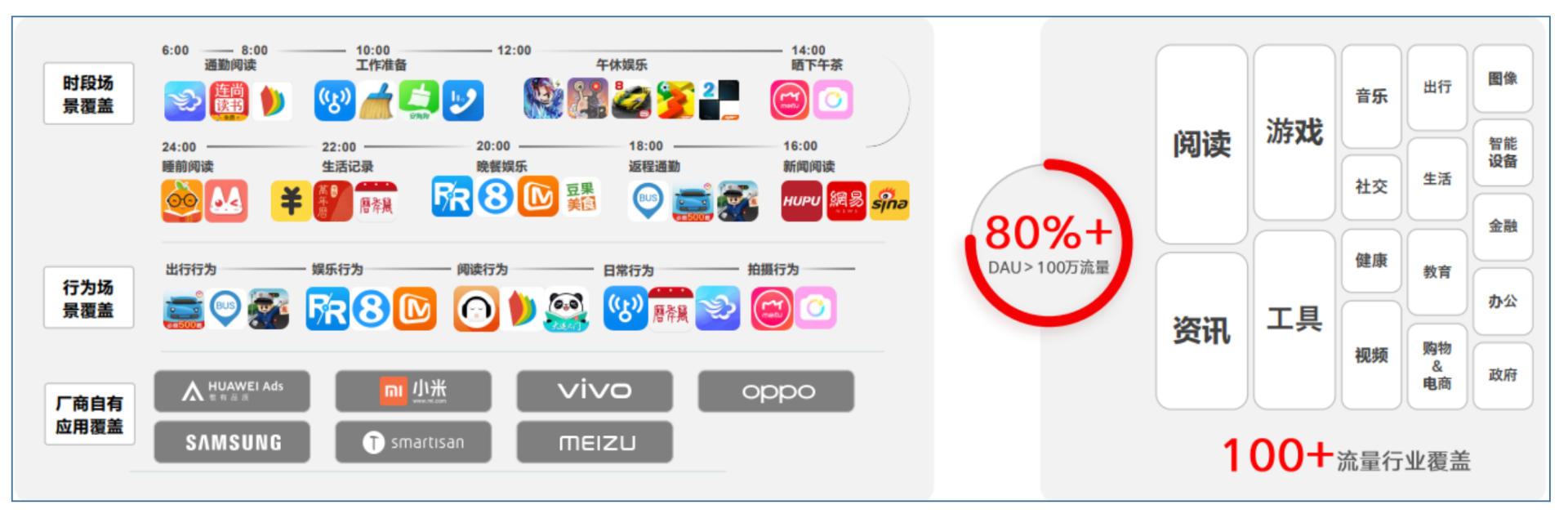 穿山甲广告平台上的站外流量,来源十分丰富,包括阅读、资讯、工具、娱乐等各类App,还有华为、小米、vivo、OPPO、三星等手机硬件厂商。