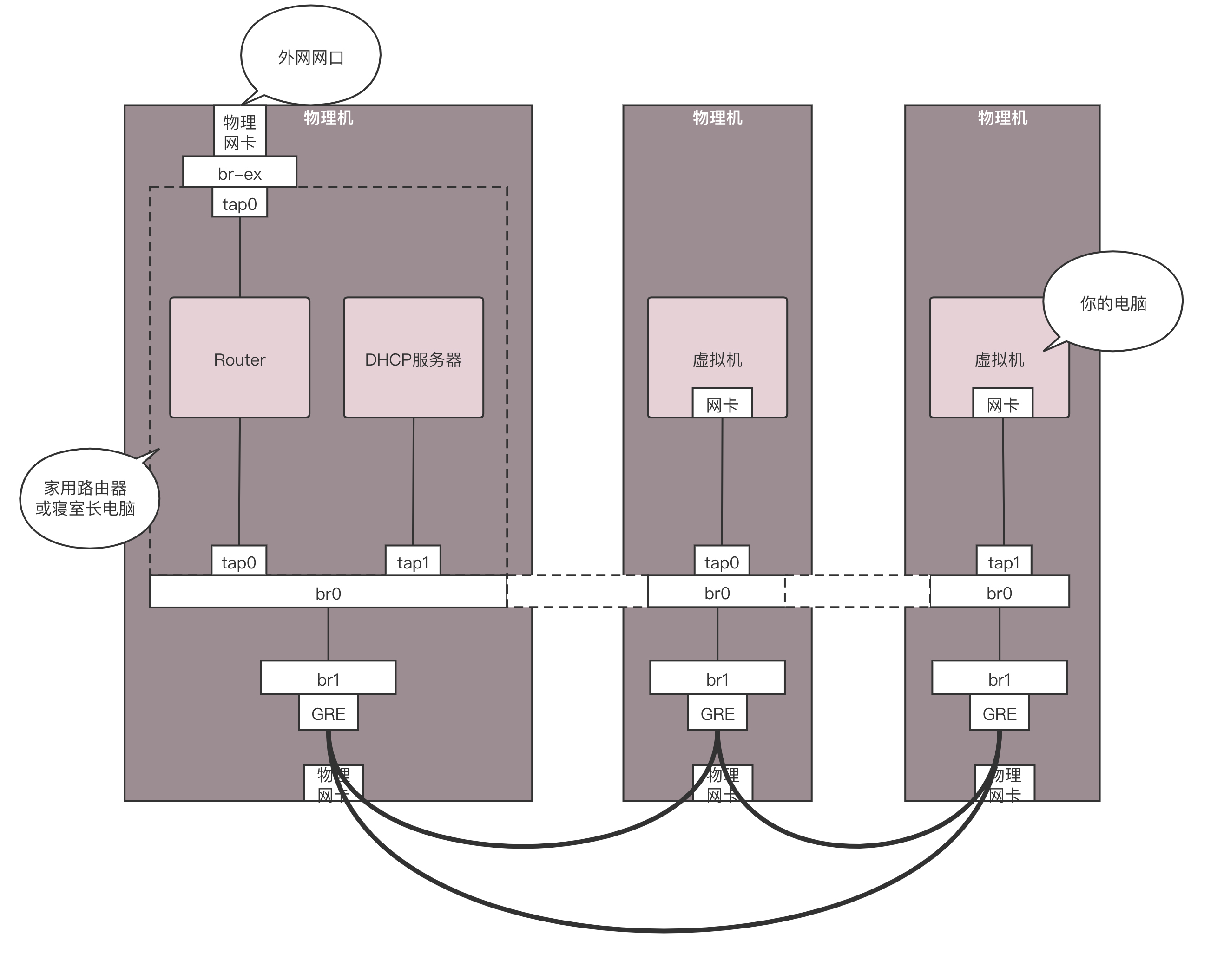 接下来的事情就惨了,你们宿舍闹矛盾了,你们要分成三个宿舍住,对应上面的图,你们寝室长,也即路由器单独在一台物理机上,其他的室友也即VM分别在两台物理机上。这下把一个完整的br0一刀三断,每个宿舍都是单独的一段。