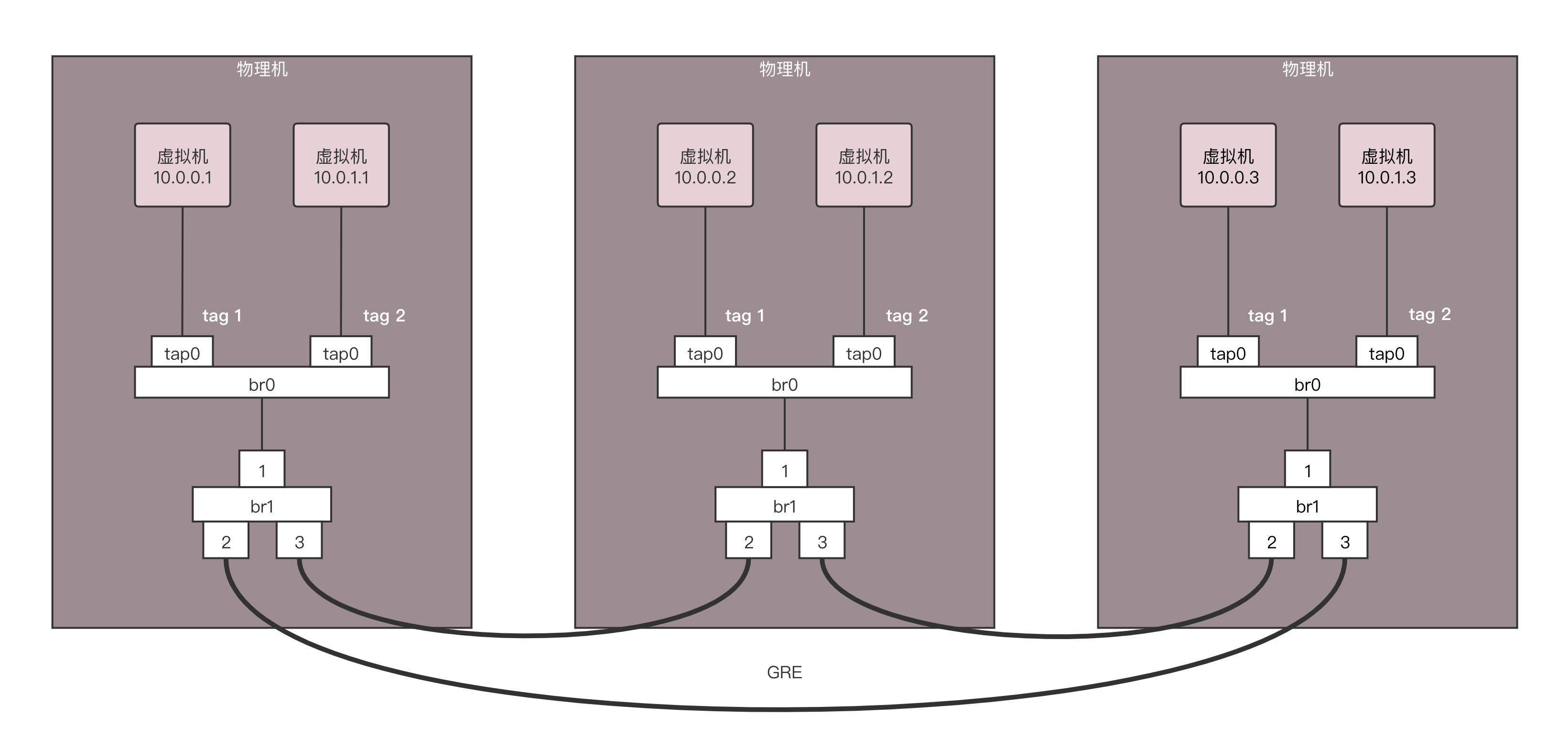 三台物理机,每台上都有两台虚拟机,分别属于两个不同的用户,因而VLAN tag都得打地不一样,这样才不能相互通信。但是不同物理机上的相同用户,是可以通过隧道相互通信的,因而通过GRE隧道可以连接到一起。