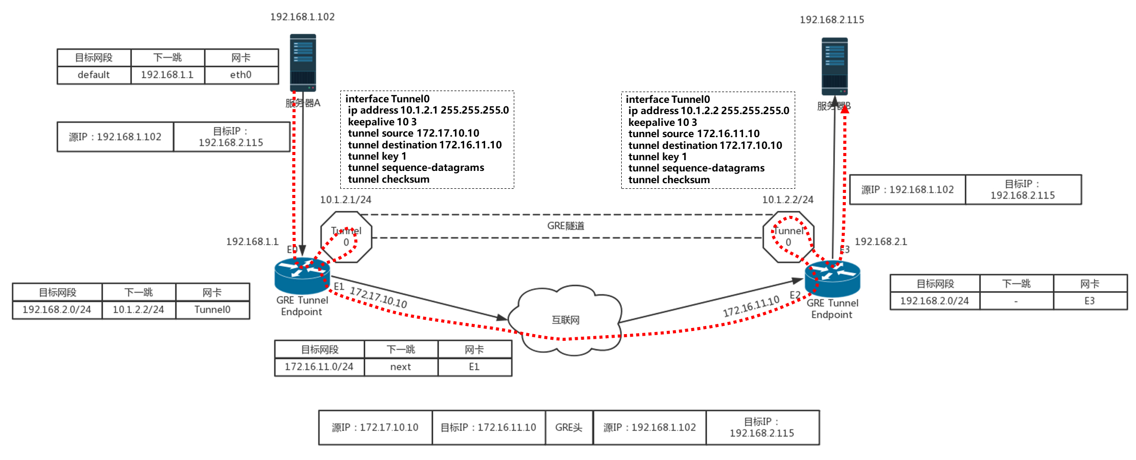 - 根据路由表,从左边的路由器,去192.168.2.0/24这个网段,应该走一条GRE的隧道,从隧道一端的网卡Tunnel0进入隧道。