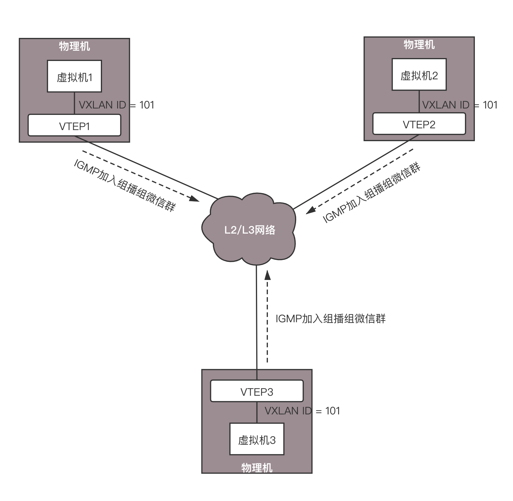 当一个VTEP启动的时候,它们都需要通过IGMP协议。加入一个组播组,就像加入一个邮件列表,或者加入一个微信群一样,所有发到这个邮件列表里面的邮件,或者发送到微信群里面的消息,大家都能收到。而当每个物理机上的虚拟机启动之后,VTEP就知道,有一个新的VM上线了,它归我管。