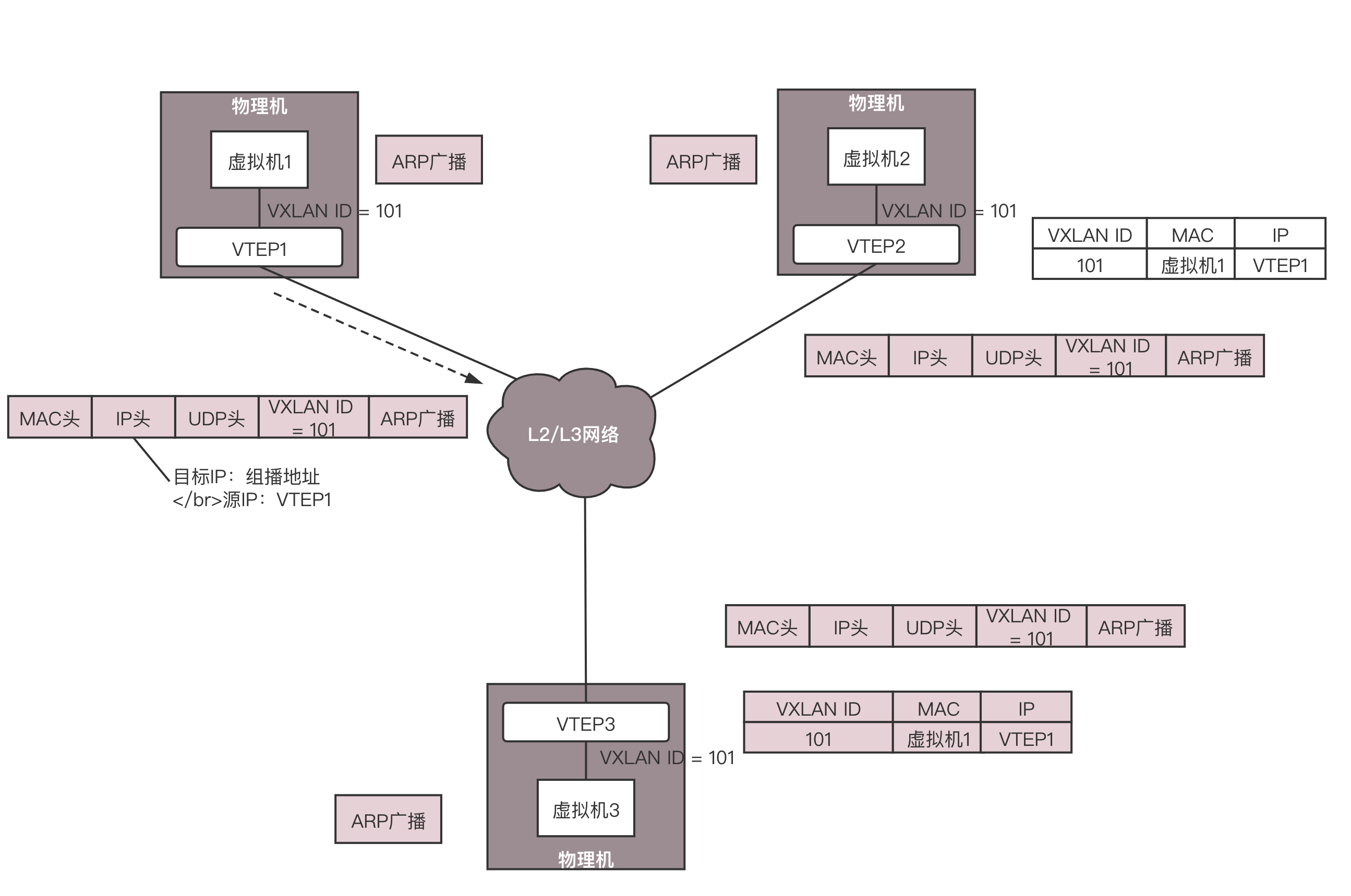 当然在群里面,VTEP2和VTEP3都收到了消息,因而都会解开VXLAN包看,里面是一个ARP。