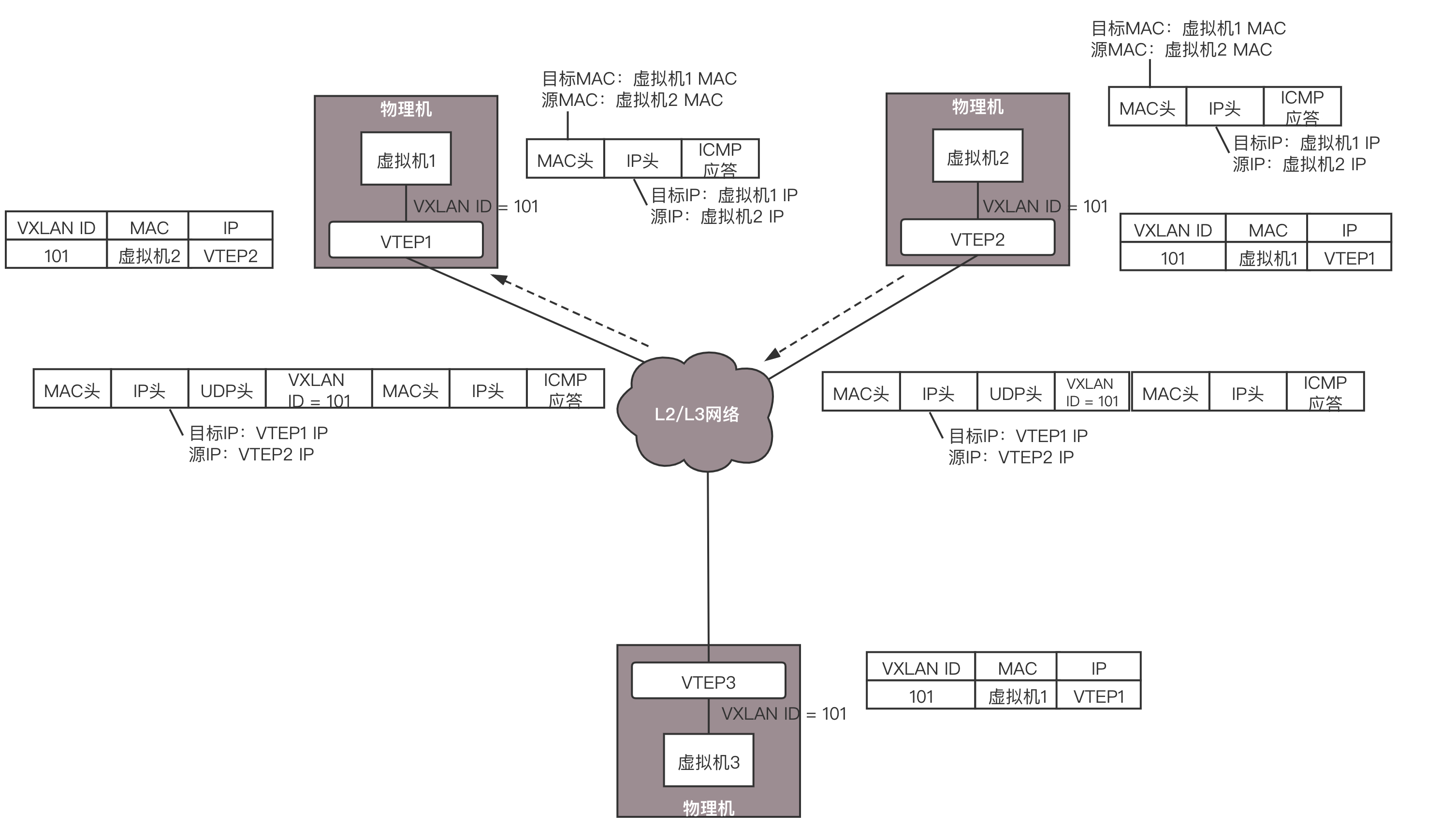 虚拟机2回复的包,到达VTEP2的时候,它当然也记得刚才学的东西,要找虚拟机1,就去VTEP1,于是将包封装在VXLAN里面,外层加上VTEP1和VTEP2的IP地址,也发送出去。