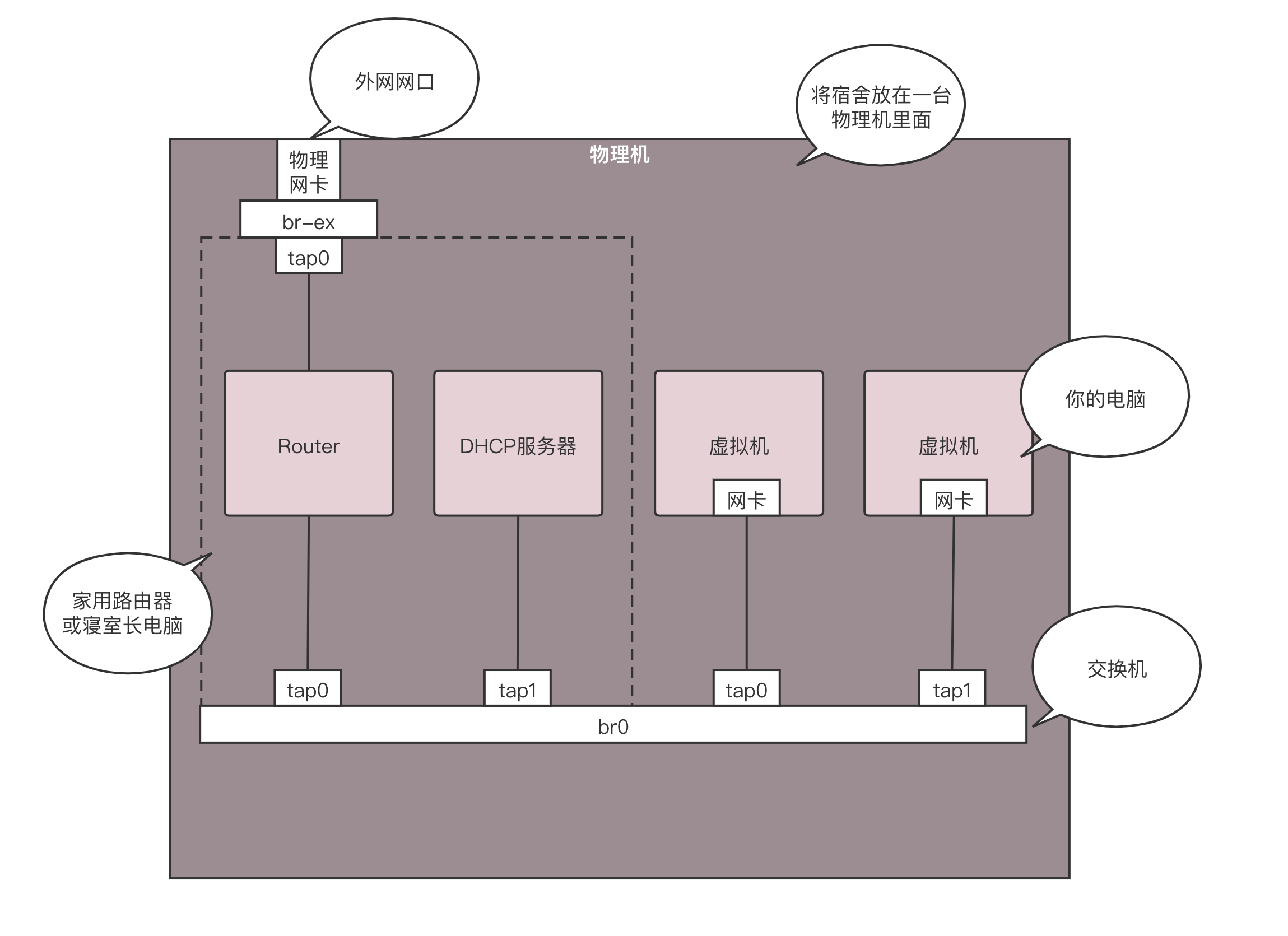虚拟机是你的电脑,路由器和DHCP Server相当于家用路由器或者寝室长的电脑,外网网口访问互联网,所有的电脑都通过内网网口连接到一个交换机br0上,虚拟机要想访问互联网,需要通过br0连到路由器上,然后通过路由器将请求NAT后转发到公网。