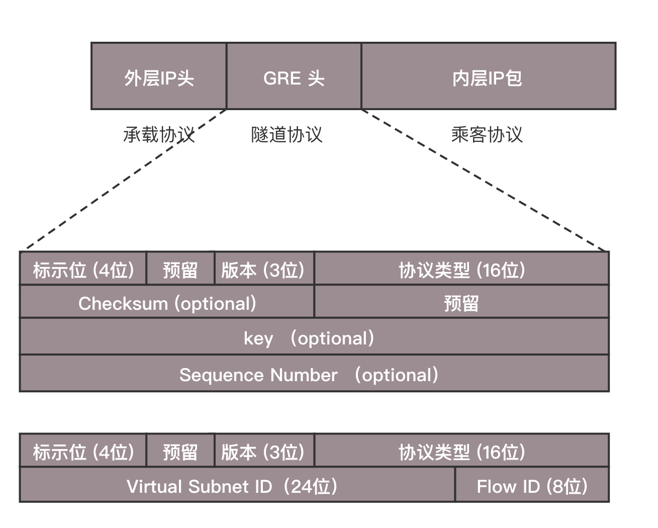 从这个图中可以看到,在GRE头中,前32位是一定会有的,后面的都是可选的。在前4位标识位里面,有标识后面到底有没有可选项?这里面有个很重要的key字段,是一个32位的字段,里面存放的往往就是用于区分用户的Tunnel ID。32位,够任何云平台喝一壶的了!