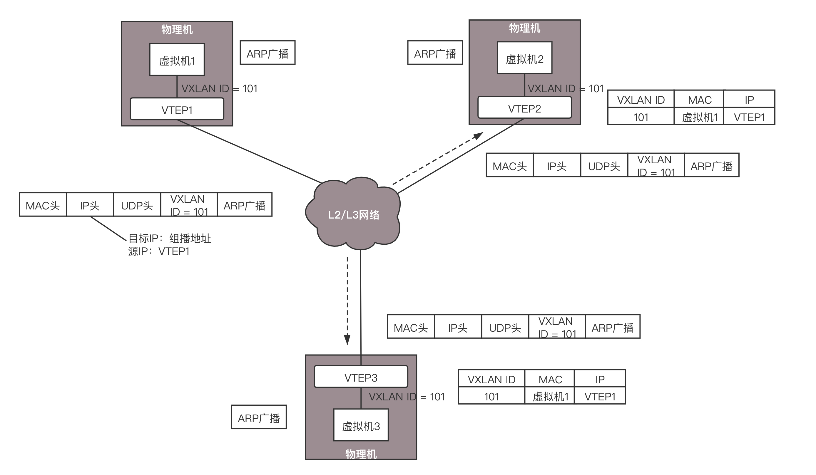 VTEP1解开VXLAN的包,发现是ARP的回复,于是发给虚拟机1。通过这次通信,VTEP1也学到了,虚拟机2归VTEP2管,以后找虚拟机2,去找VTEP2就可以了。