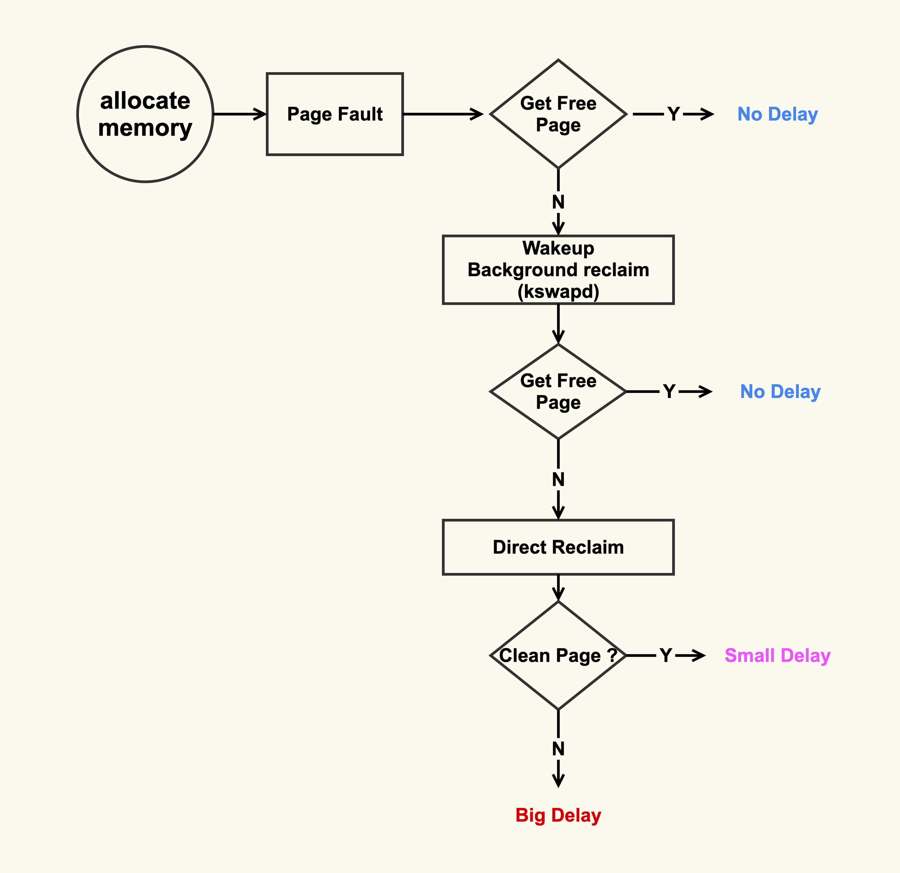 从图里你可以看到,在开始内存回收后,首先进行后台异步回收(上图中蓝色标记的地方),这不会引起进程的延迟;如果后台异步回收跟不上进程内存申请的速度,就会开始同步阻塞回收,导致延迟(上图中红色和粉色标记的地方,这就是引起load高的地址)。