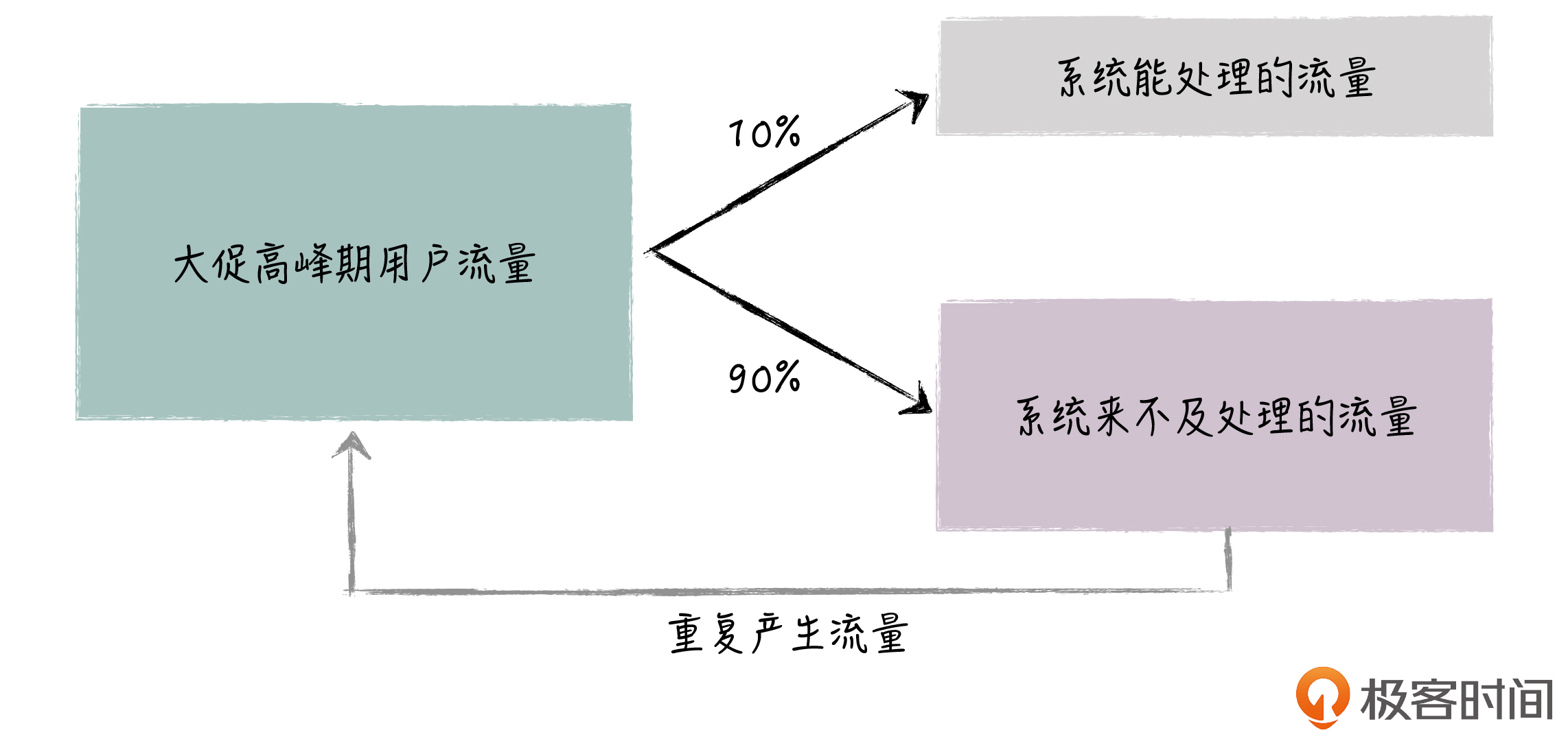 而在正常情况下,系统因为资源有限,只能处理10%的流量,无法处理剩下的90%流量,瞬间高并发的流量涌入,很大程度上会引起后台系统超时报错,导致用户下单不成功。这样一来,用户就会反复刷新页面,多次尝试下单,不但用户的体验不好,而且系统的压力会更大。