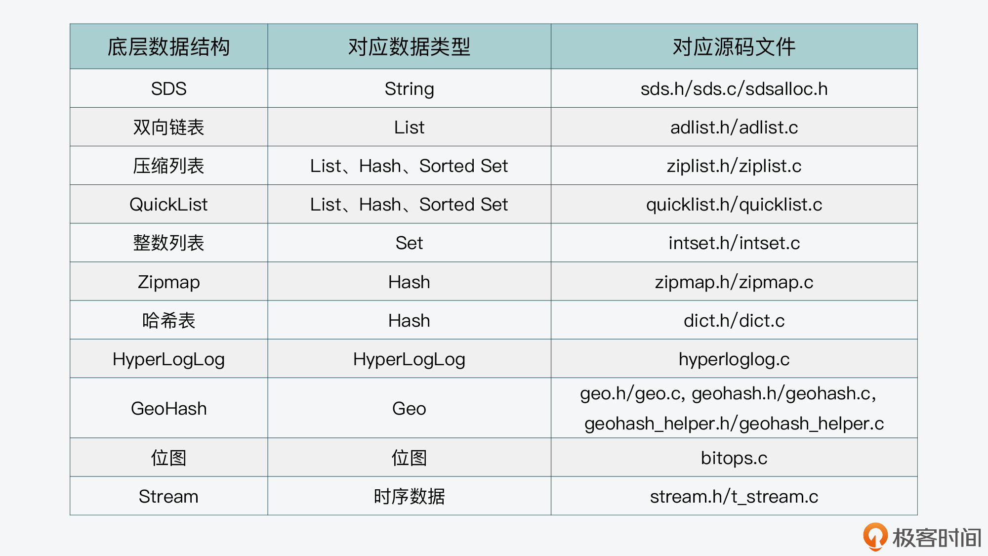 不过,因为Redis实现的底层数据结构非常多,所以这里我把这些底层结构和它们对应的键值对类型,以及相应的代码文件列在了下表中,你可以用这张表来快速定位代码文件。
