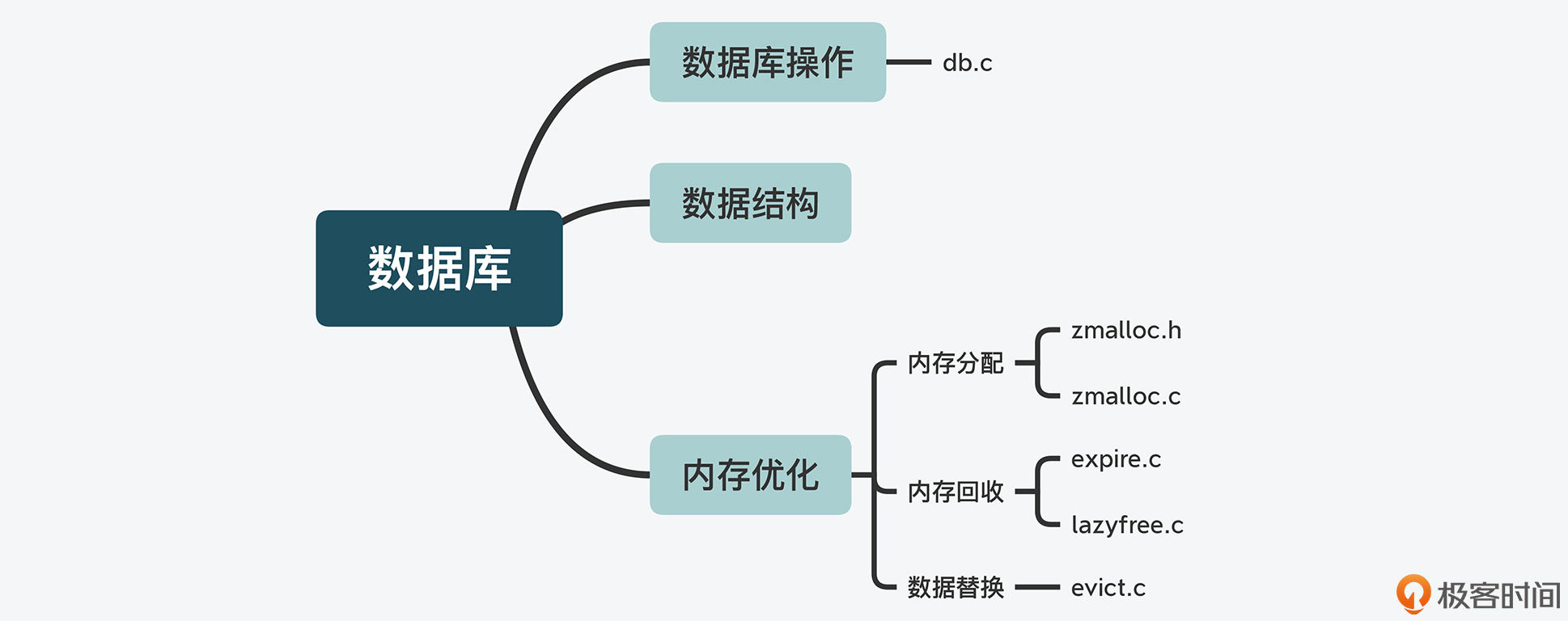 那么,在了解了Redis服务器实例的主要功能代码之后,我们再从Redis内存数据库这一特性维度,来梳理下与它相关的代码文件。