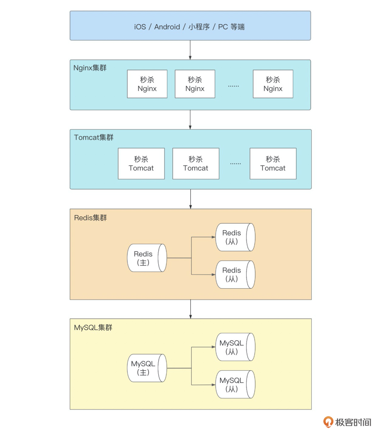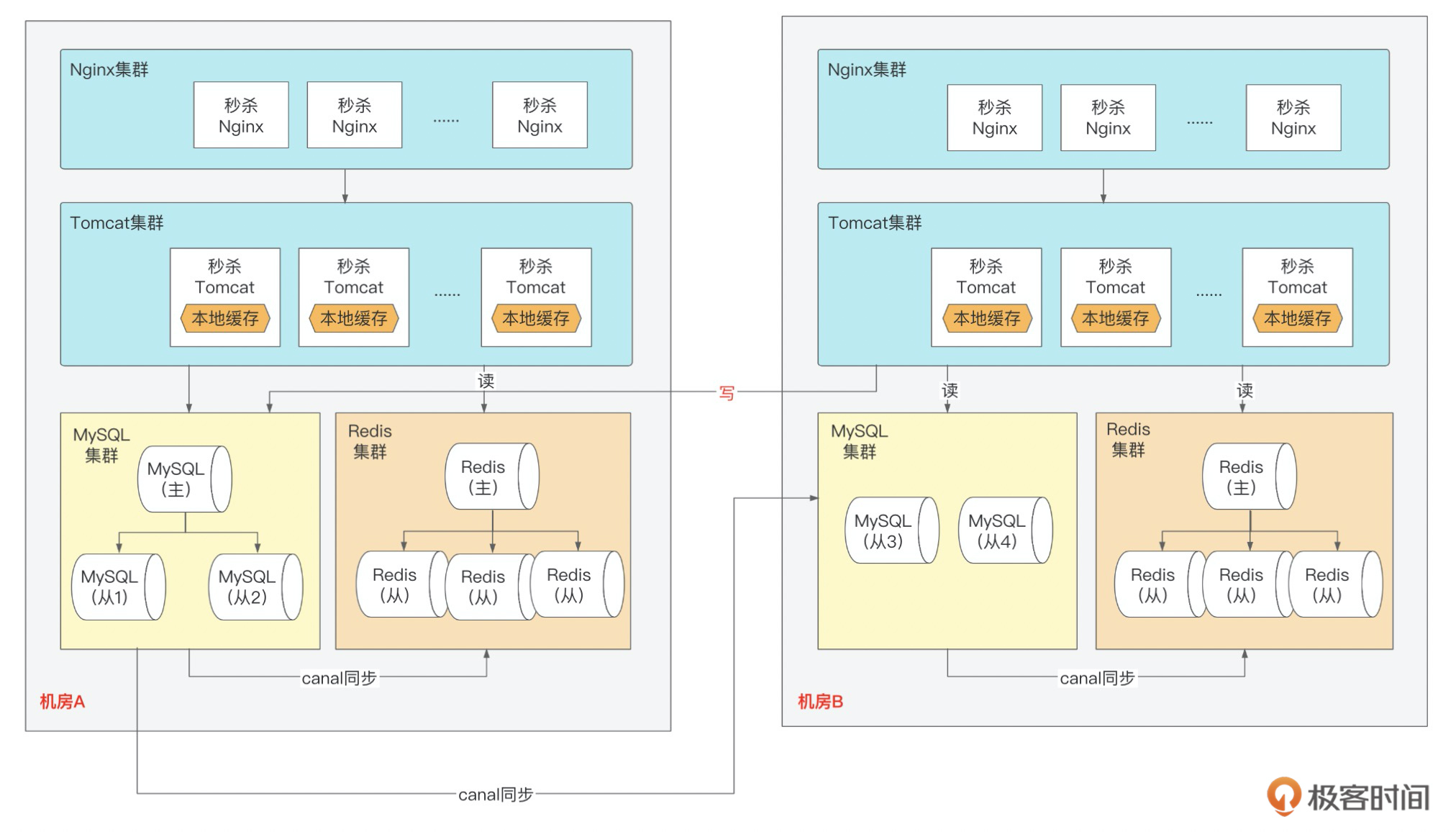 如上图所示,就是秒杀系统的“同城双活”方案。从Nginx层、Tomcat层,到Redis、MySQL层,我们都做了双中心部署,不管哪一层出现故障,都可以灵活切换。