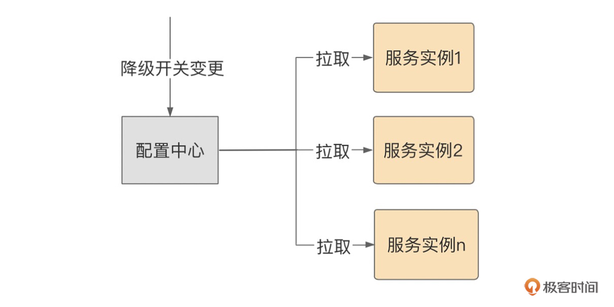 这里我们顺便也看下降级开关的设计,比较简单,核心思路就是通过配置中心,对降级开关进行变更,然后推送到各个微服务实例上。