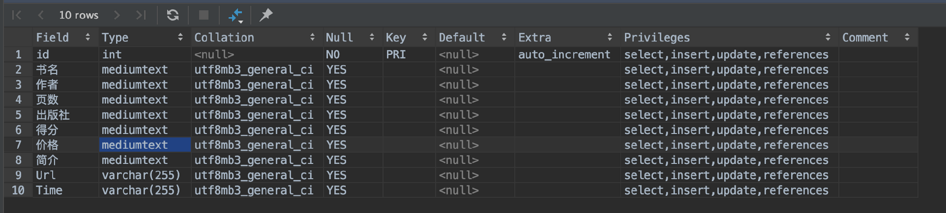 运行SHOW FULL COLUMNS FROM douban_book_list; 可以查看生成的表的字段和类型。