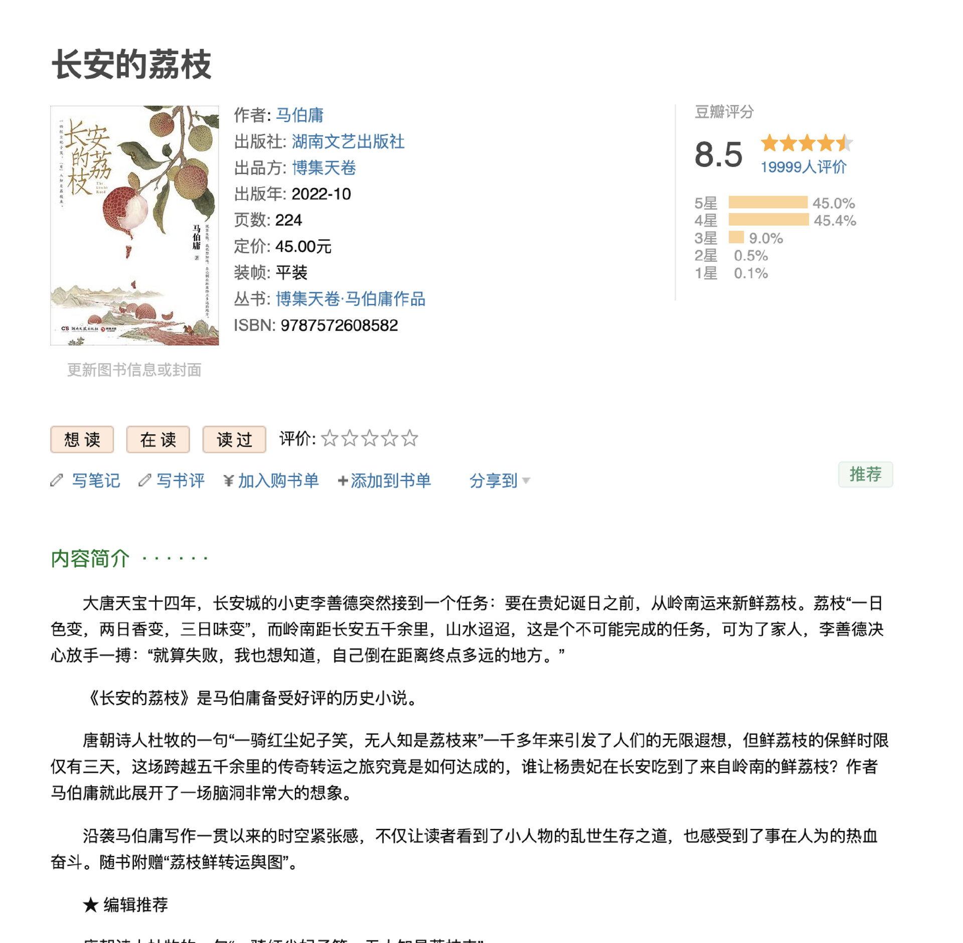 最后,点击图书的详情页,可以看到图书的作者、出版社、页数、定价、得分、价格、简介等信息。