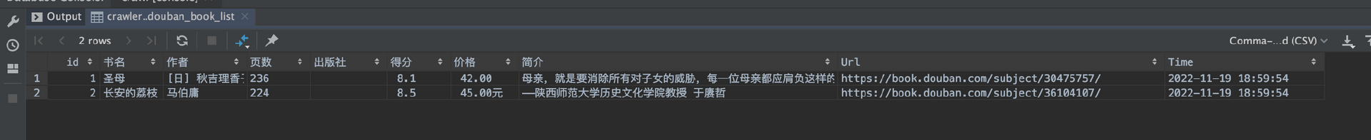 运行select * from douban_book_list; 可以查看表中已经插入的数据。