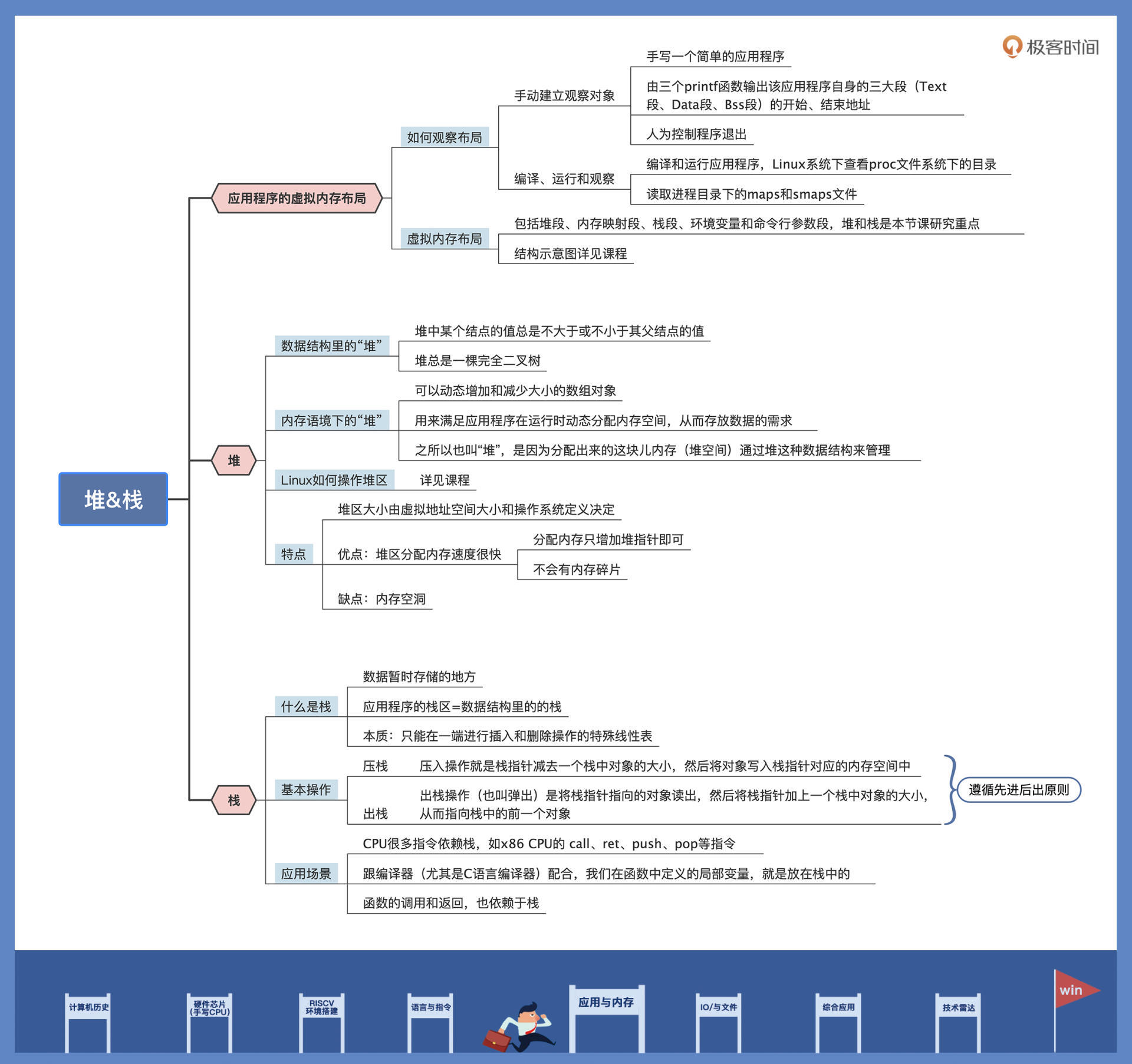 今天我们学习了应用虚拟内存布局。需要区分清楚的是,堆是堆、栈是栈,它们之间区别很大。理解了这节课,相信你也能清晰地把堆和栈的本质讲给身边的同学了。