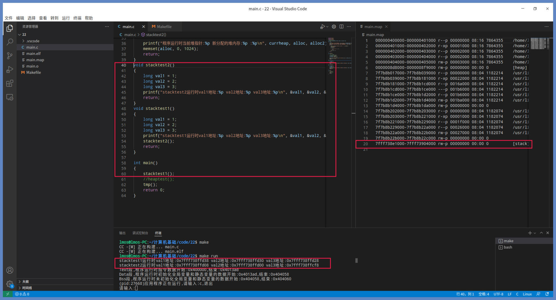 由上图可以看出,两个函数的三个变量都落在了应用程序的栈区,我们可以用课程开头的命令得到图中的map文件,就可以看到应用程序栈区的地址区间的范围了。
